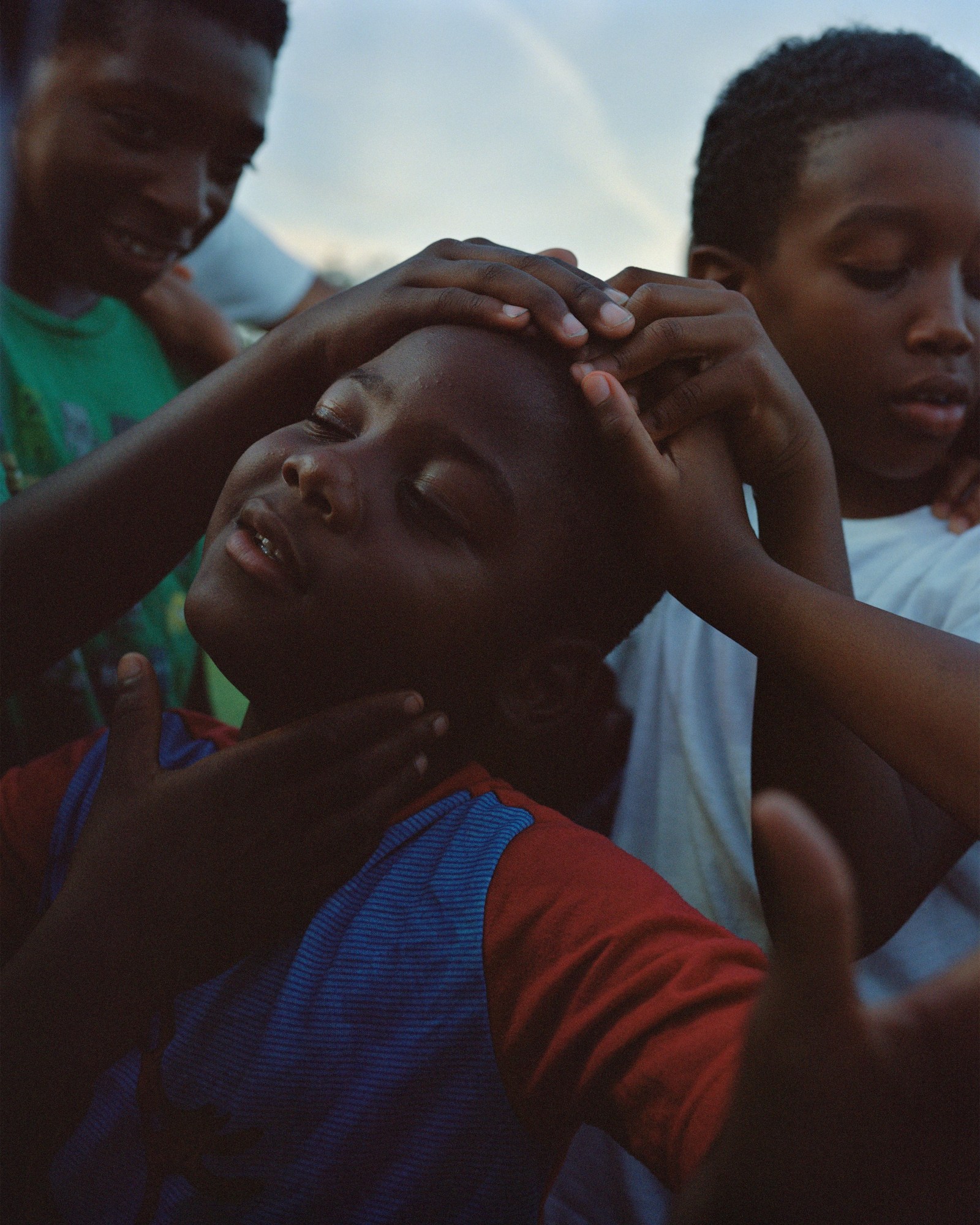 In an untitled photograph, a young boy in turquoise shorts and glasses plays on the sidewalk. He seems enamoured by a small leaf floating in a puddle, the water reflecting him and the light of his surroundings to the viewer. In a second photograph, a boy dressed in a vibrant blue-and-red shirt closes his eyes as his friends rest their hands on his head.