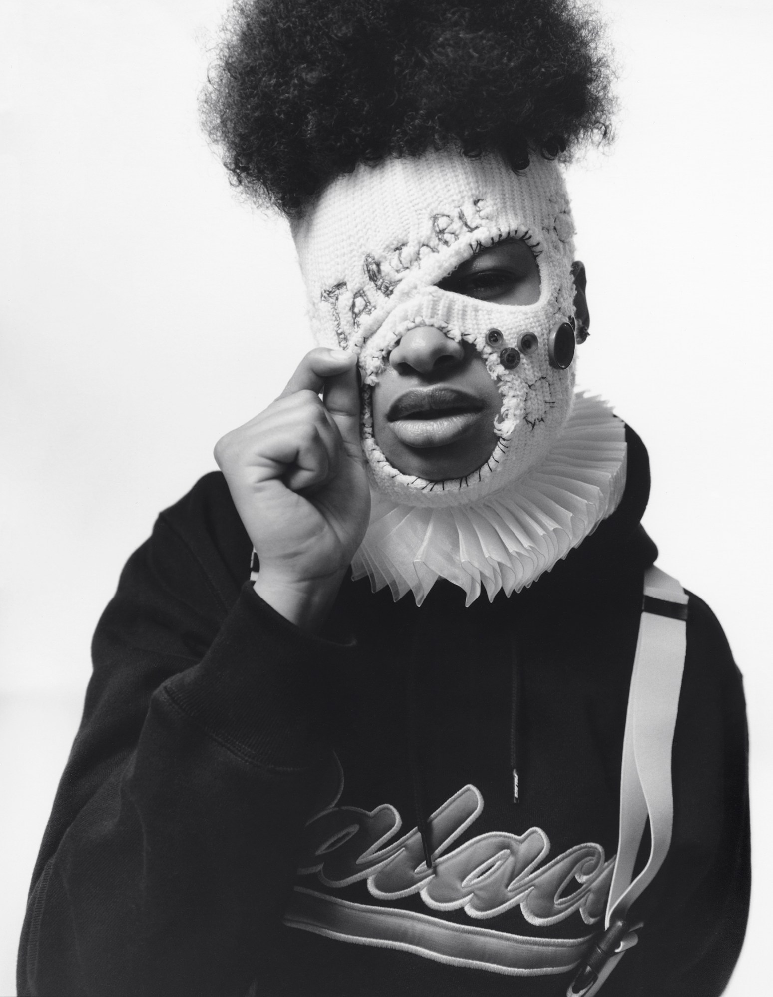 And there really is. Talia is exciting, experimental and punk as hell. From behind her signature balaclava and ruff, her curls sticking out of the top like a crown, she raps in a gravelly voice. “I utilise music as a soundscape catalyst for imaginary world building. It’s a place,” she says. “I really feel like music is an audible book of wonder, where walls can be talking tongues and lagoons are full of caramel and fire is glass and whispers are fanciful sirens and all is well but only until…”