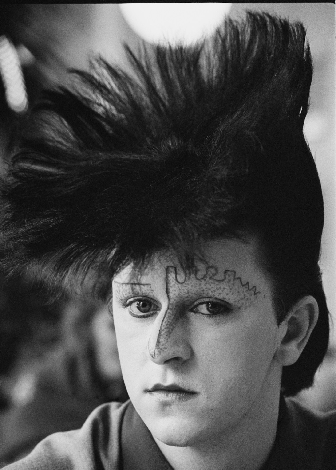 Credited as a pioneer of the New Romantic movement, Strange never shied away from a bold beauty look, at the same time using his position as nightclub host to encourage his guests to come dressed for the occasion. In this photo from 1980, the same year Strange appeared in the music video for David Bowie’s “Ashes to Ashes”, the young singer showcases some of the era’s most evocative makeup trends. Heavy black eyeliner, a pointy cupid’s bow, and expertly engineered hair accentuated by an abstract line drawing in the centre of his face. This look is simultaneously derivative and nonsensical. Perfectly in keeping with the new wave brief.