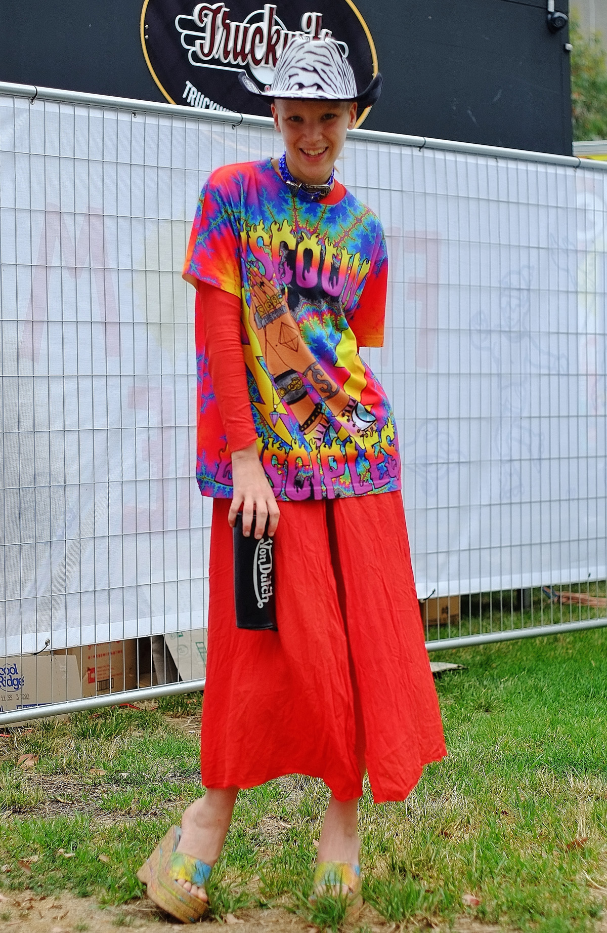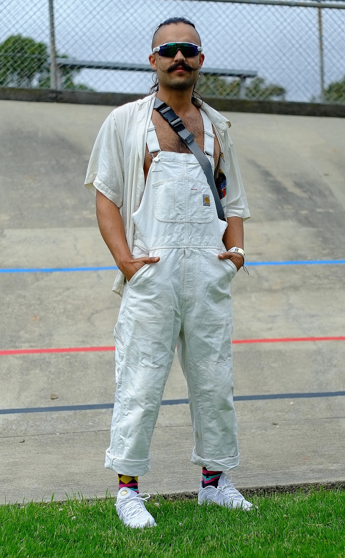 What are you wearing? All white everything, Carhartt dungarees, white Nike tns and a classic 70s party shirt.