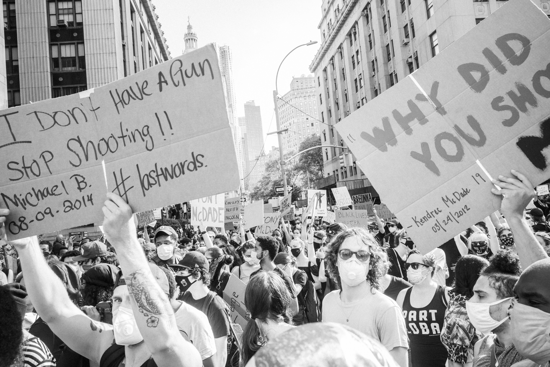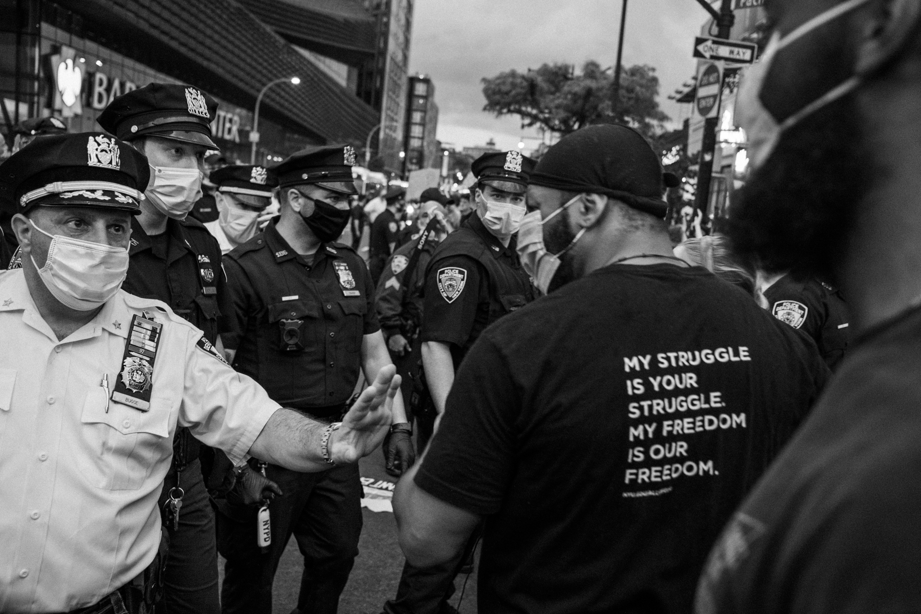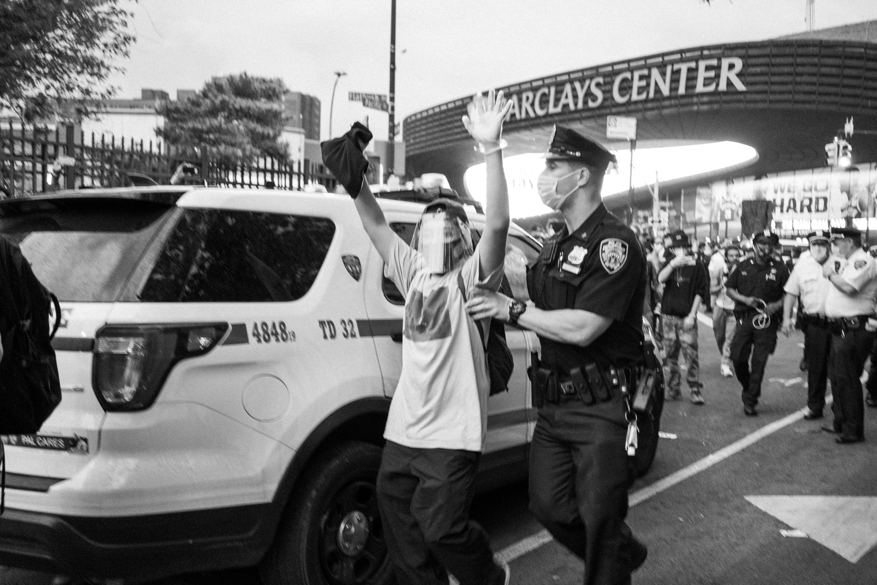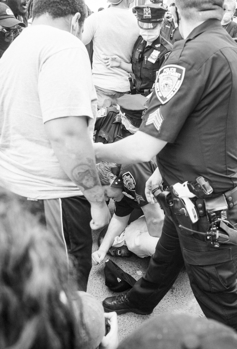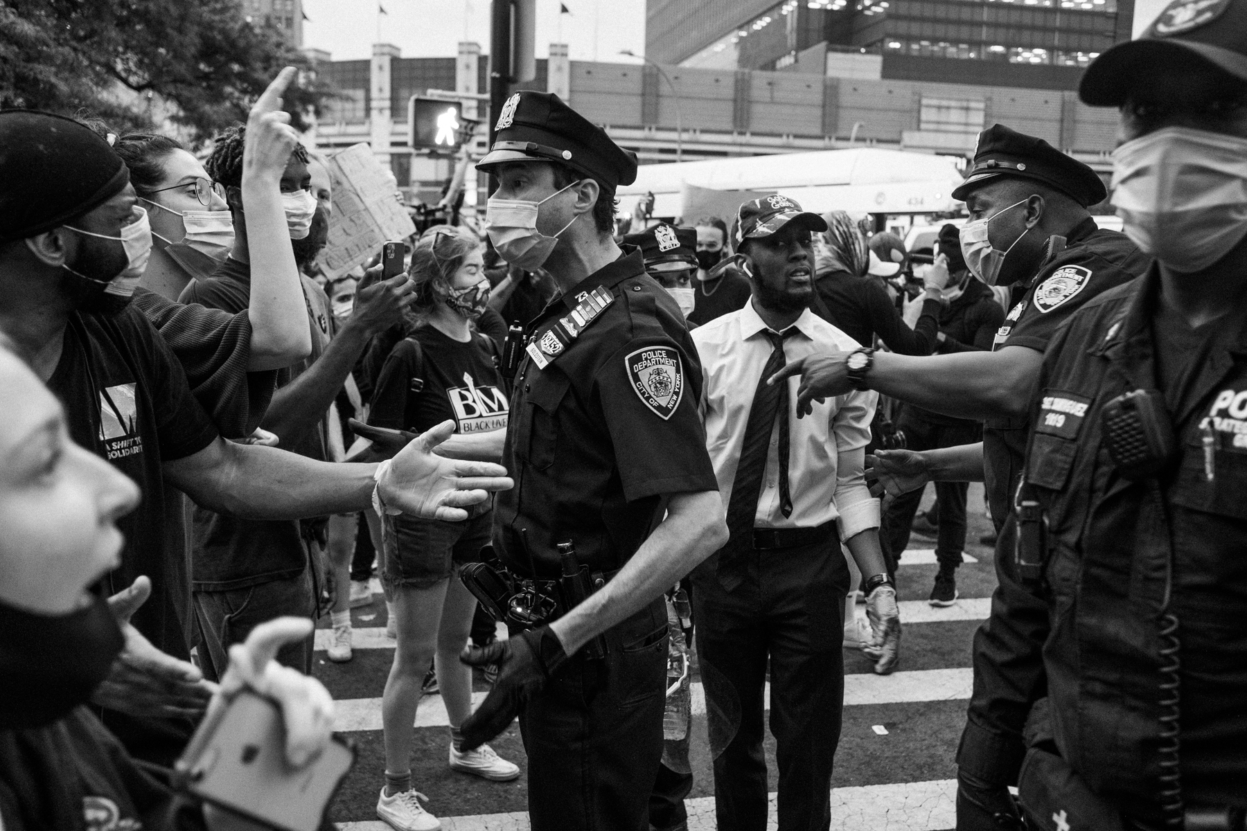 Over the weekend, every borough of New York City saw protests sparked by the killing of George Floyd at the hands of the police in Minneapolis, which occurred only one month after Ahmaud Arbery was shot and killed in his own neighborhood, and of course, follows the unjust deaths of Breonna Taylor, Alton Sterling, Eric Garner, Trayvon Martin and countless other unarmed black people in America. Thousands demonstrated in the East Village, Times Square and Harlem, Flatbush in Brooklyn, and Jackson Heights in Queens, as well as the Bronx and Staten Island. These were just a few of the many protests against police brutality and racial injustice that occurred from Los Angeles to Atlanta, which have resulted in further police violence and curfews in many cities. Officers have used tear gas, rubber bullets and pepper spray on protestors, and here in New York, a cop car drove into crowds of people in Brooklyn — now, days later, the city either seems to have descended into chaos, or be business as usual, depending on the view from your window. Photographer Pierre Crosby was there to document the unrest and ongoing riots.