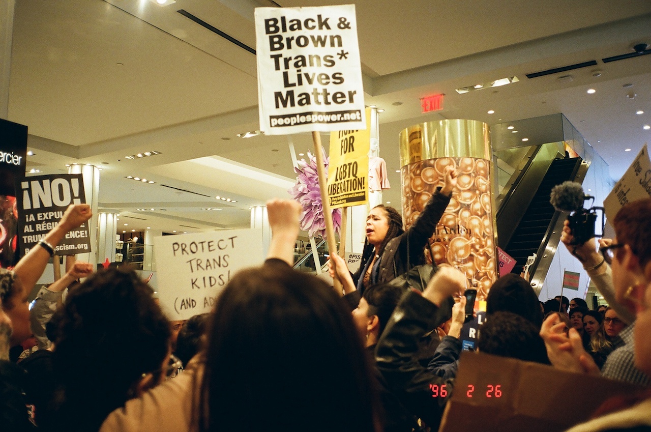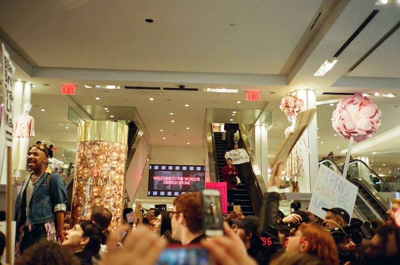We made our way through Chelsea and rounded the corner at Madison Square Garden, before flooding into the Herald Square Macy’s on 34th Street. A flashing jumbotron screen inside proclaimed it to be the city’s biggest department store. “It’s fitting,” one march leader cried, standing among a constellation of makeup counters, “that we’ve taken over the cosmetics section! Because whether you like it or not, this is where trans people have found our identities for a very long time.” Many women working in the department cheered right along with us.