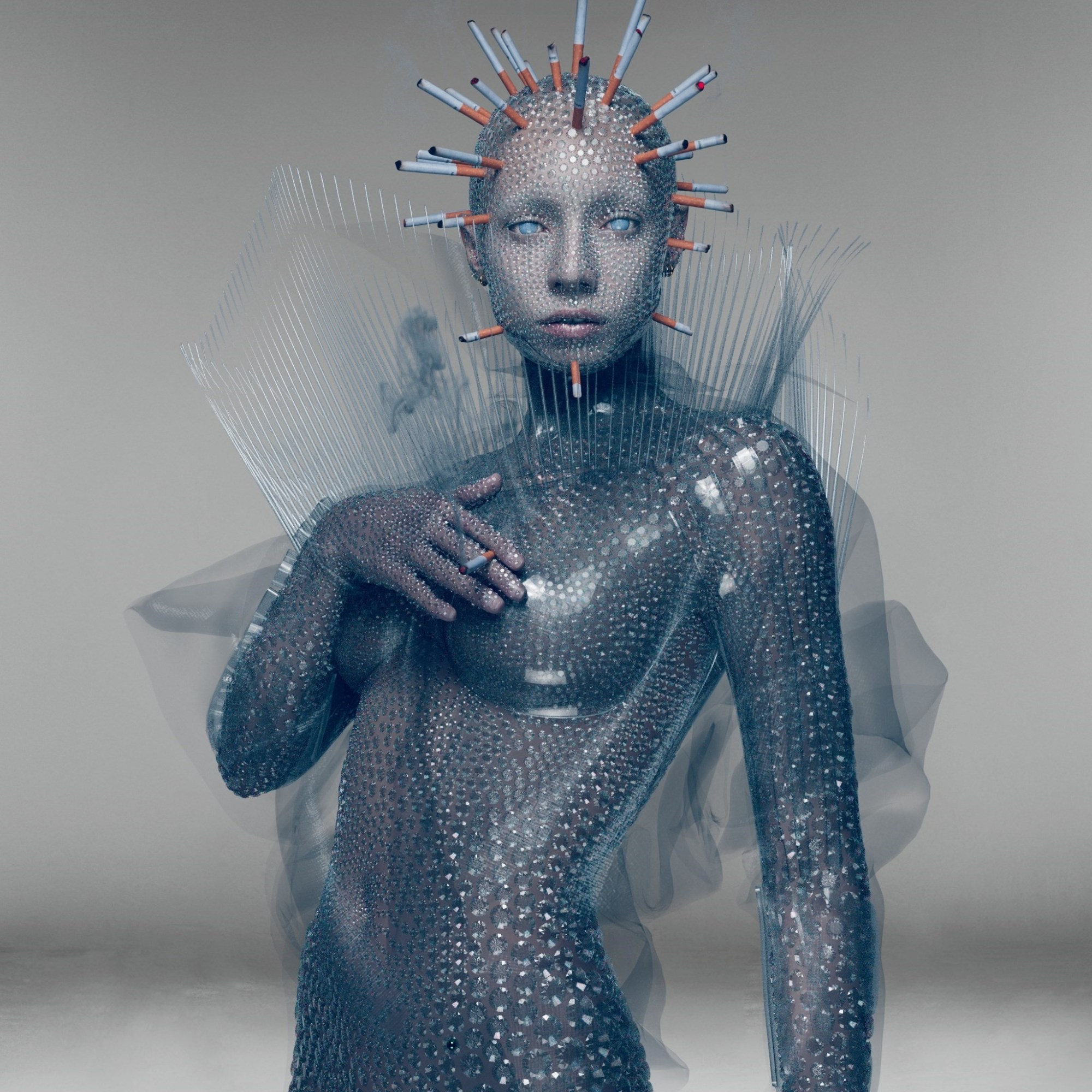 A digital render of model Jazzelle Zanaughtti wearing a shimmering digital body suit and cigarette face mask