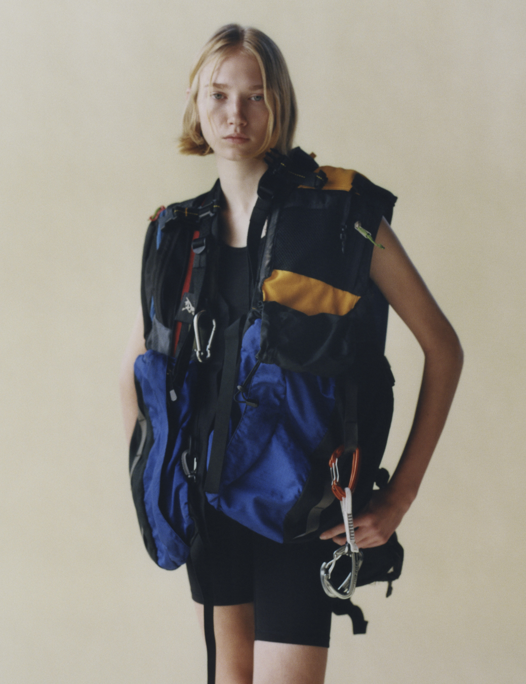 Nicole grew up in an outdoorsy family constantly playing sports, so she also grew up around Arc’teryx, but their pieces were too expensive to purchase. Her exposure to gorp – though it wouldn’t have been called that then – was by way of brands like The North Face and Patagonia. “People in Columbia jackets and stuff, that’s what I wore to middle school,” she says, noting that the streetwear cred was something both she and Arc’teryx fell into later by default. “It’s such a funny moment in fashion that people are styling Arc and finding ways to work that in with a Bottega bag… As a climber, some of the things that I see are cringy, but it’s timely. Something about having a tactical jacket makes you want to use it. There’s this feeling of being prepared: the pockets, the colours, the materials. And the more you go outside, the more you’re in nature, the more you realise we have to protect and preserve it. That’s my hope for the trend.”