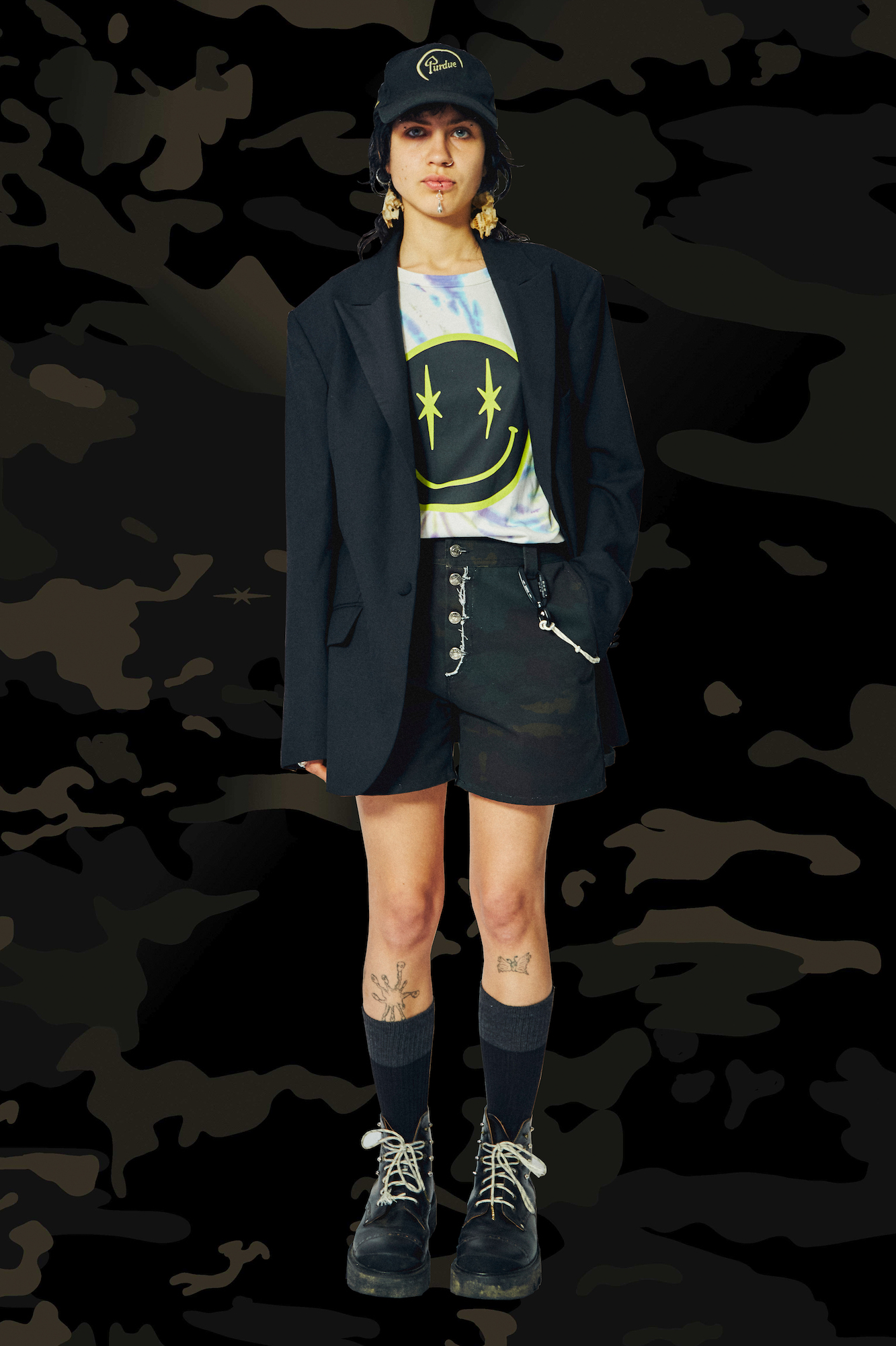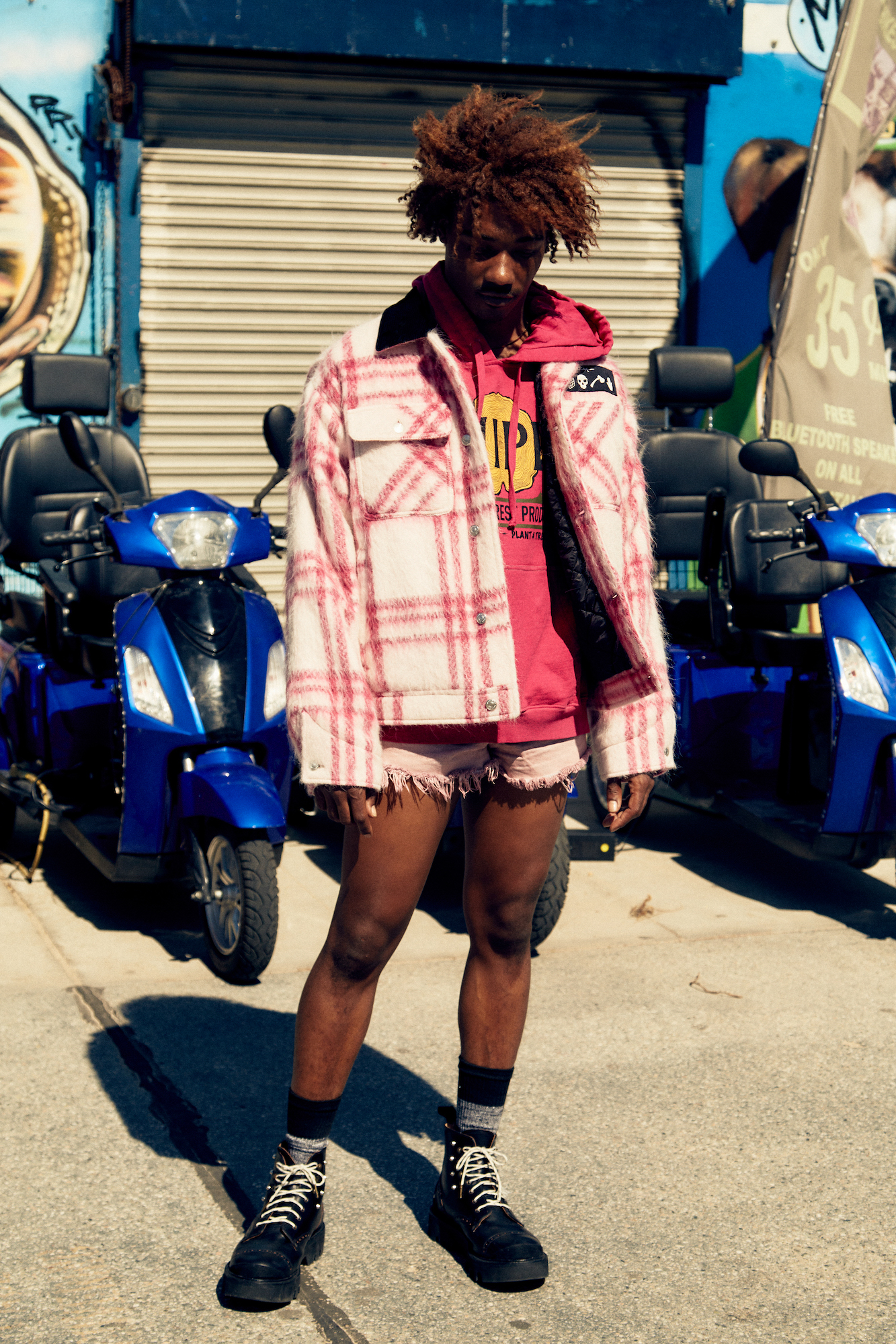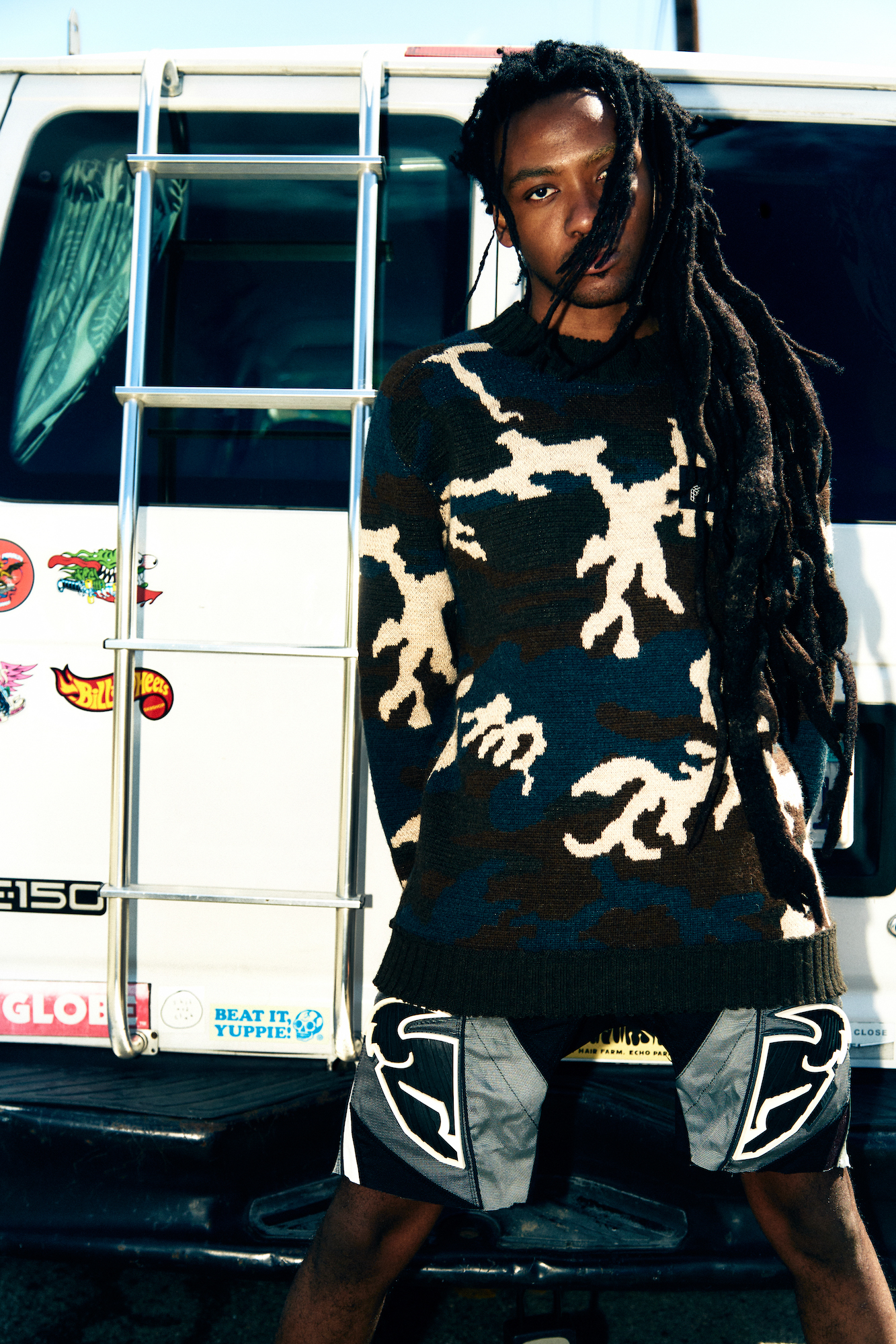 For his swansong collection as an American in Paris, Spencer and his team have issued a 30-look ode to the place they’re headed to. Taking the move as an opportunity to “really reflect on our short history and what the core message of PHIPPS is,” he says, the collection is perhaps best thought of as a manifesto or a definitive sartorial glossary for the world he’s built over the past four years. Camouflage serves as a throughline — a cipher for “conversations about identity and blending in — what you choose to reveal and hide, and how changing contexts can suddenly make you stand out,” Spencer explains — with blotchy patterns magnified on tailoring and intarsia knits, and unconventionally recontextualised in the case of a bright orange vest. A ecologically conscious approach — a longstanding pillar of the Phipps’ ethos — makes itself felt in pieces spliced together from deadstock garments, like halter dresses fashioned from deadstock T-shirts, and a miniskirt collaged together from waistbands, while an evening-ready sensuality is brought into the mix by way of slinky spaghetti strap slips and cocktail dresses. It’s all enough to consider making the hop to La La Land yourself! MS