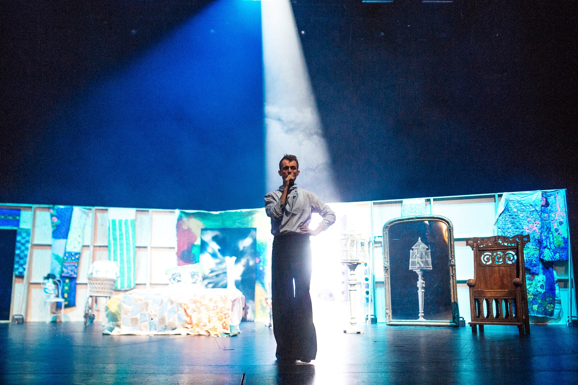 Having collaborated on a performance for the Venice Biennale together, Nils and Ida decided to recreate the space they made together for the Opera House show — a bedroom filled with discreet sculptures. But this time the space would rotate, revealing three different rooms, the second one introducing Silas, a ballet dancer, which was also inspired by the sparseness of Marina Abramović’s performances: a table and two chairs. A tapestry. An empty space for him to fill with song.