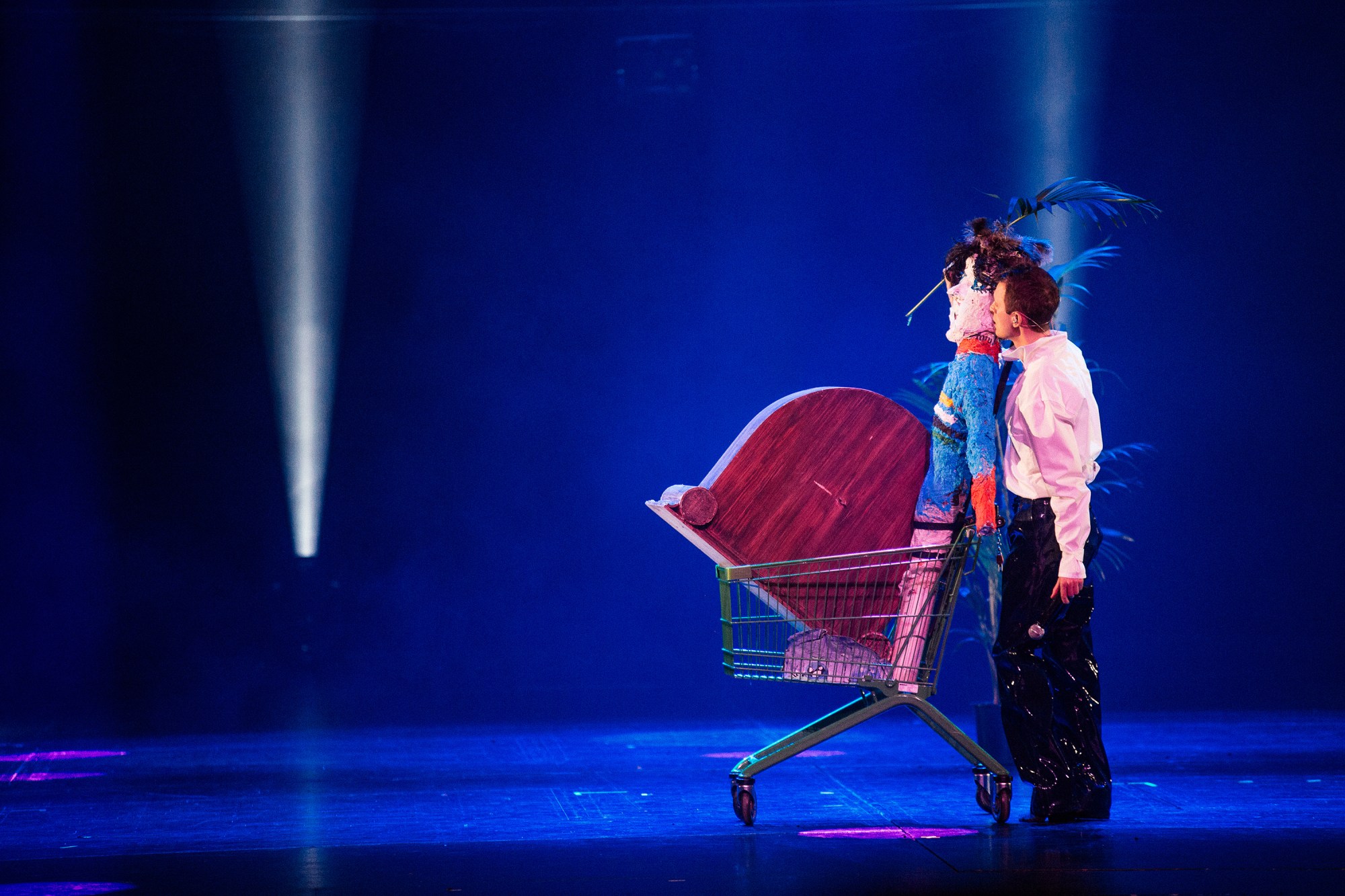 Following the traditional opera format of including an intermission, the first half of the show ended on a high: the cool, calm space transformed with a rainbow of lazers, a topless saxophonist in Westwood Bondage heels and a buzz cut, and a bevy of dancers in nude suits. Telling the story of Nils as a young boy, Contemporary Dancing is the first song he ever made — the biographic narrative describing a young boy who isn’t allowed into the ballet school in his tiny village. “It’s very camp and tongue-in-cheek, I haven’t performed it for five years because, for a long time, I didn’t like to dance on stage.” The chorus shifts keys and crosses genres — ‘dance, dance daaaaaaaance, contemporary dancing,’ he sings. And he’s right, you can’t just stand there. “I couldn’t help thinking that the song would be an amazing end to the first act and so [the dancer] Silas Henriksen contacted one of the dance students at the National Academy of Arts her in Oslo, Natanya Kjølås, and asked her if she and some of her classmates would like to join — she made such a beautiful choreography to the song.” For Nils, who has always been interested in dancing but never done anything about it, it allowed him some liberation to do a pure dance routine where he felt out of his element, without singing.