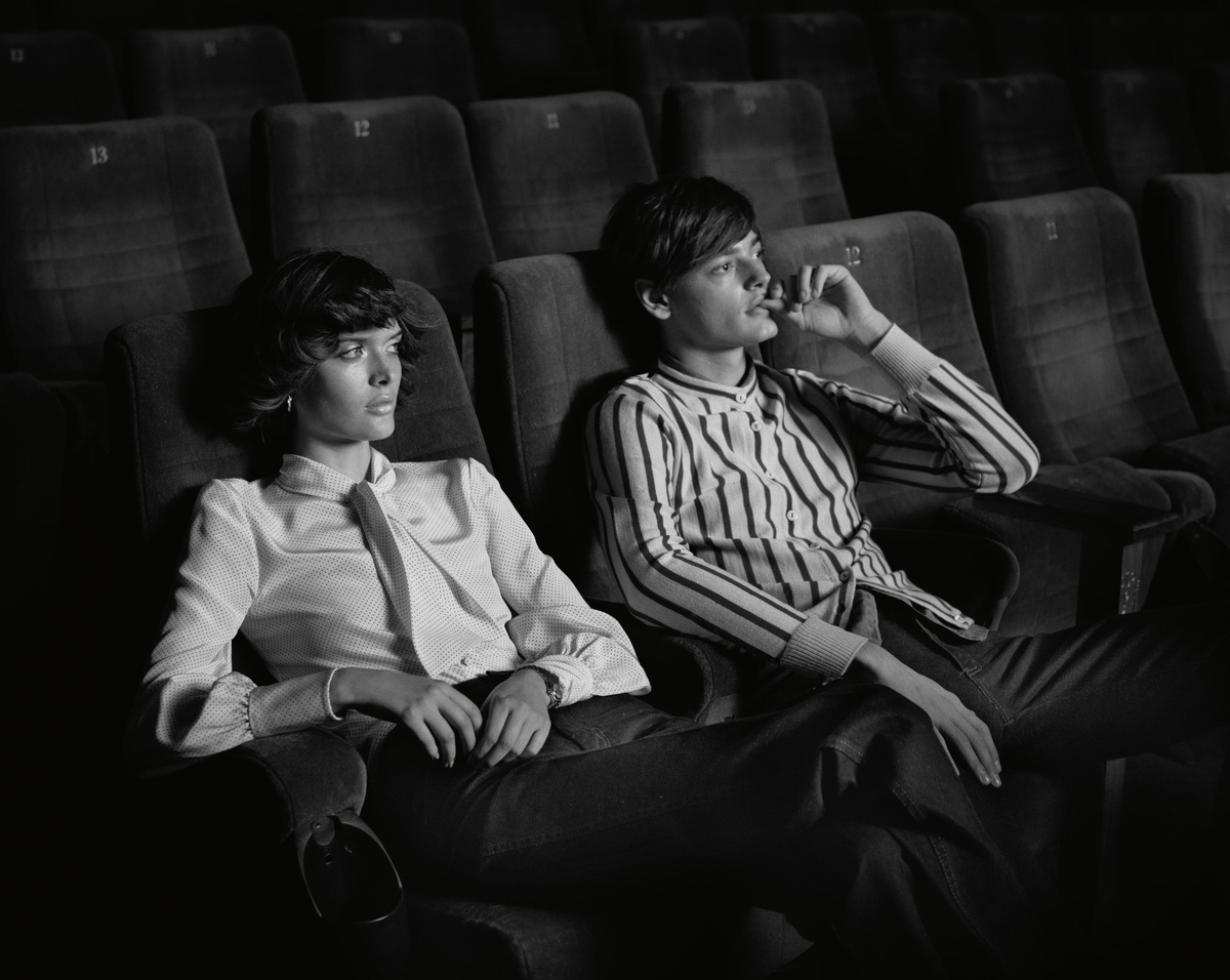 Sam wears blouse and jeans Saint Laurent by Hedi Slimane. Watch model's own. Jacob wears cardigan vintage at Beyond Retro. Jeans G-Star.
