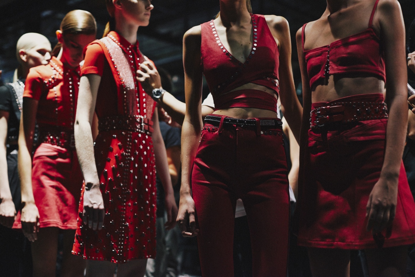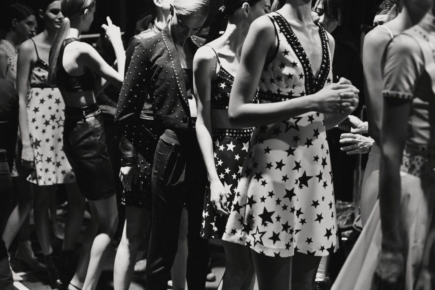 These stars became a larger graphic motif throughout the collection, pulling together the more hardware-heavy leather pieces with lighter, more playfully printed dresses: “It started in the studding and once that play happened, the prints sort of evolved from there. It felt very different and new for Diesel Black Gold, the playfulness of it all.”