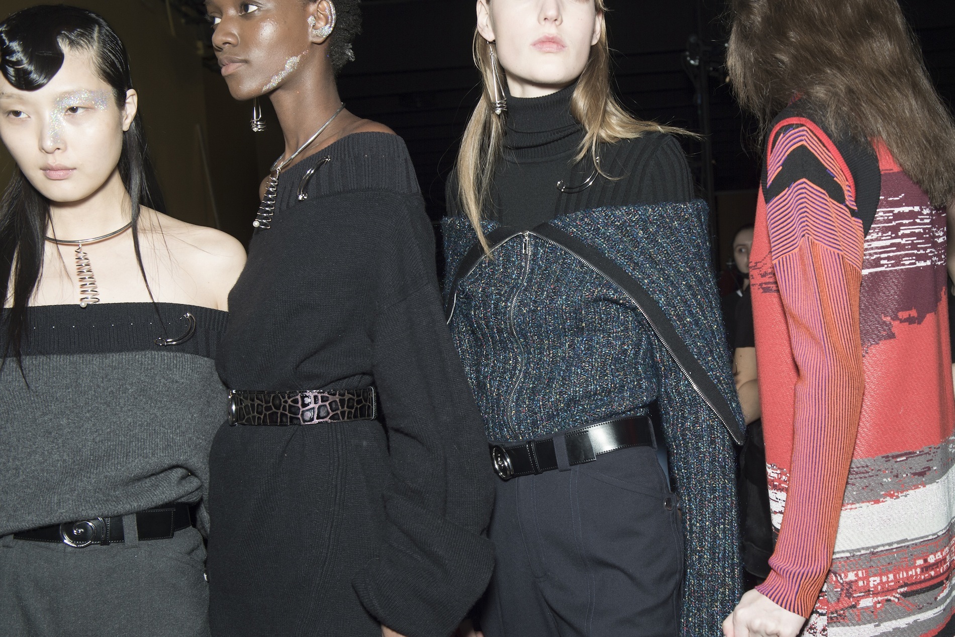 That clothing paid tribute to Mead not just in the incorporation of his illustrations on dresses and sweatshirts, but in his vision of the future as, in part, familiar. Lim and Leon didn’t do much conceptual conjecturing; they showed what we’re into right now. Slouchy off-the-shoulder knits, strong and straight silhouettes, denim (yes, jeans will probably still exist in 2100) and over-the-knee boots. The designers put a special focus on fabric development this season, which resulted in a shimmery series of knit jacquards. “We wanted this strong, feminine woman to feel really empowered,” said Leon. “That’s how people around us want to feel.”