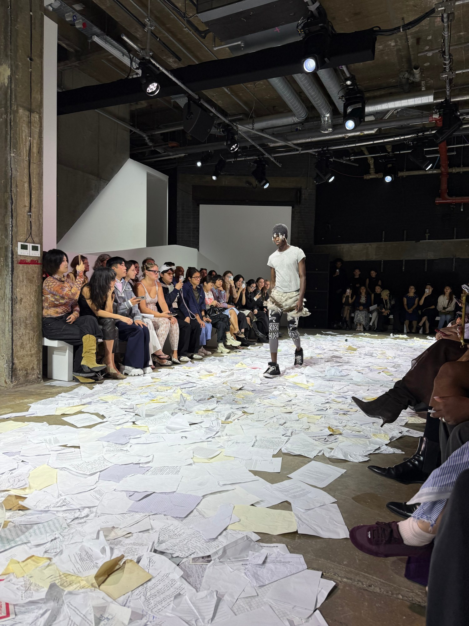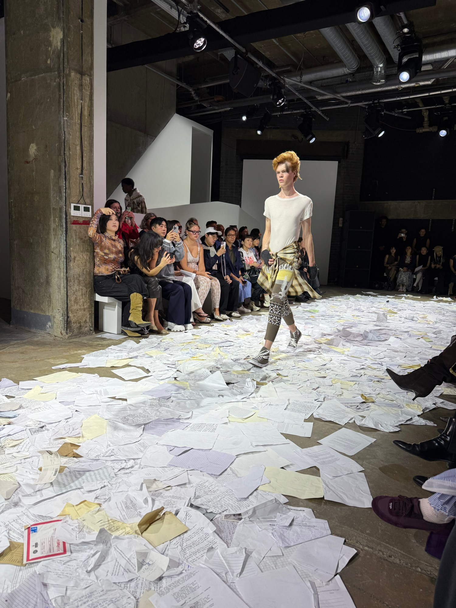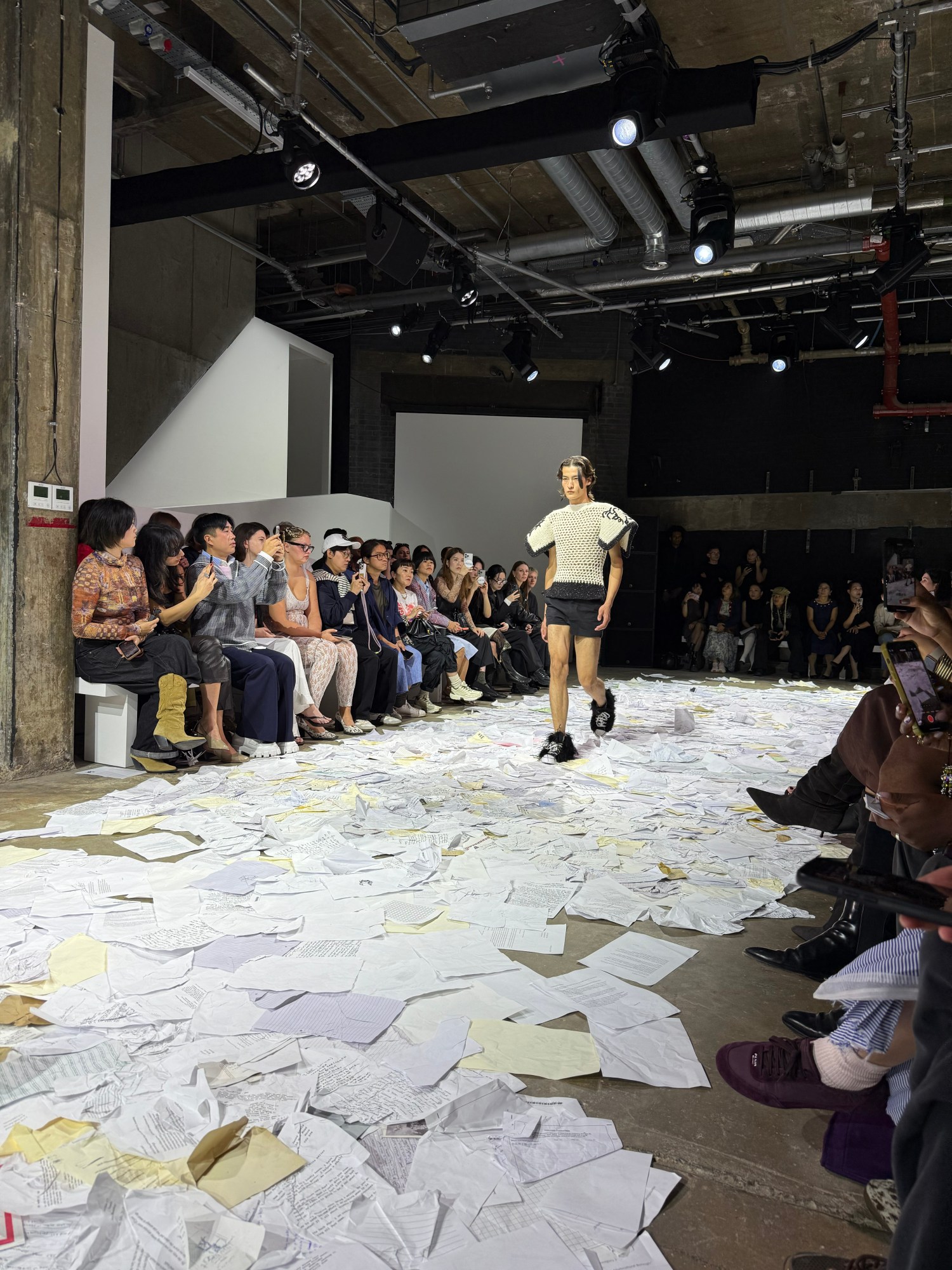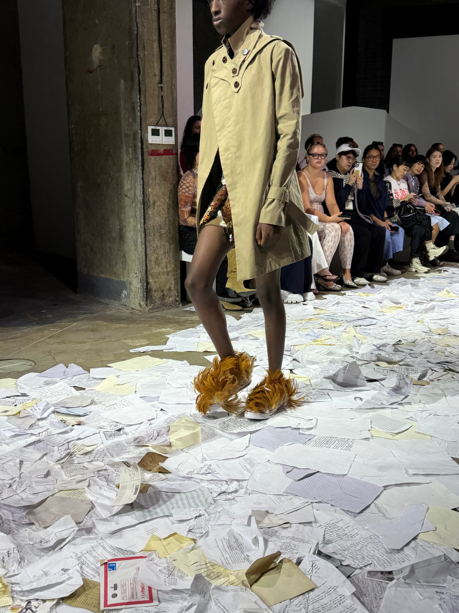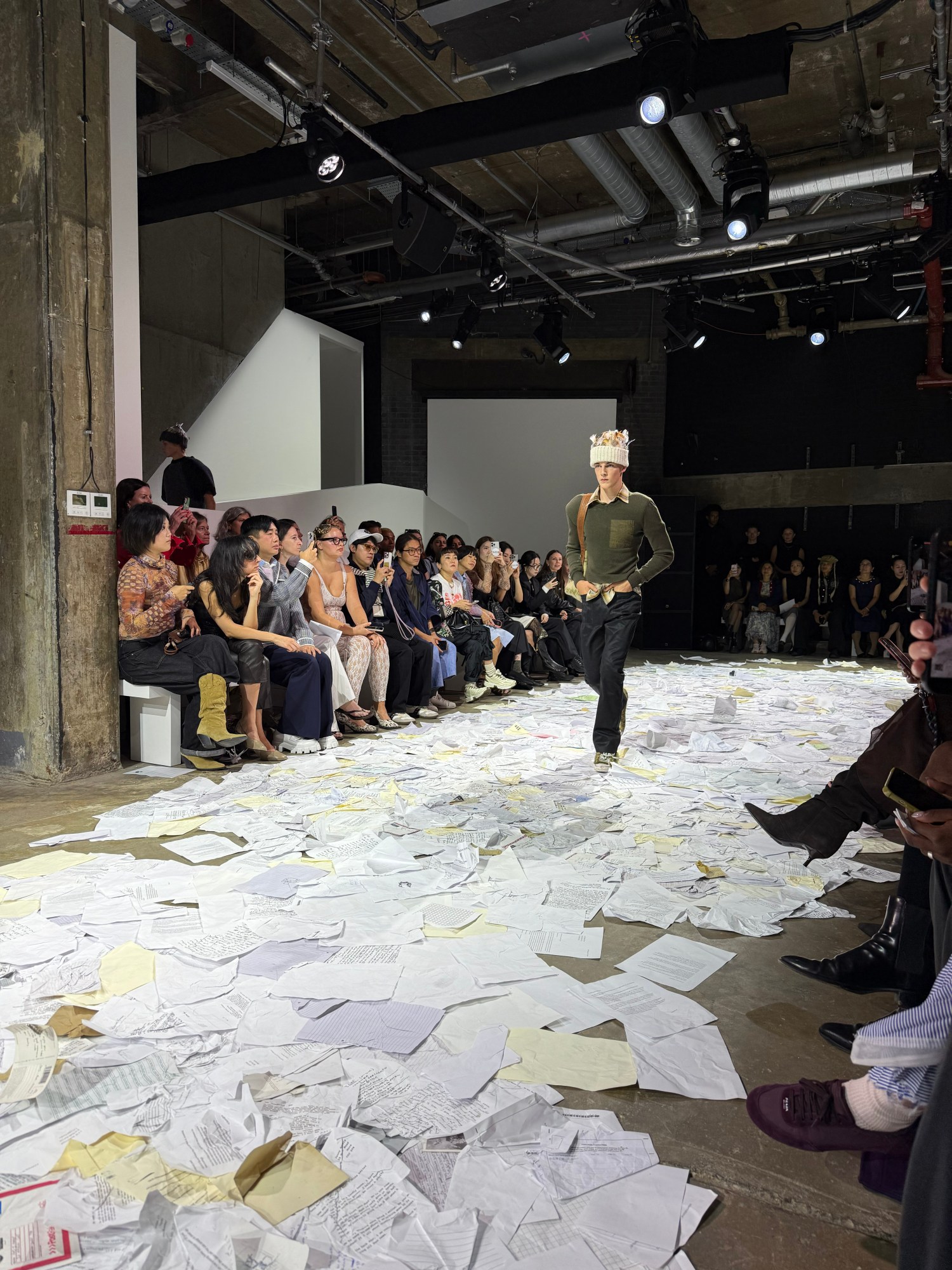And so, at 10 a.m. sharp on the second day of London Fashion Week—the hour usually reserved for cold brew and regrets—Ouyang stages his debut under BFC’s NewGen programme. The set is spare but poetic: fragments of letters scattered across the floor, a direct nod to his Spring 2026 theme, “Don’t Shoot the Messenger.” The idea comes from messenger birds carrying news that never arrives, a metaphor for our digital lives: chaos, miscommunication, the noise of endless, half-filtered messages. “You’re in this cocoon of information,” he says, “but the message doesn’t always get through.”