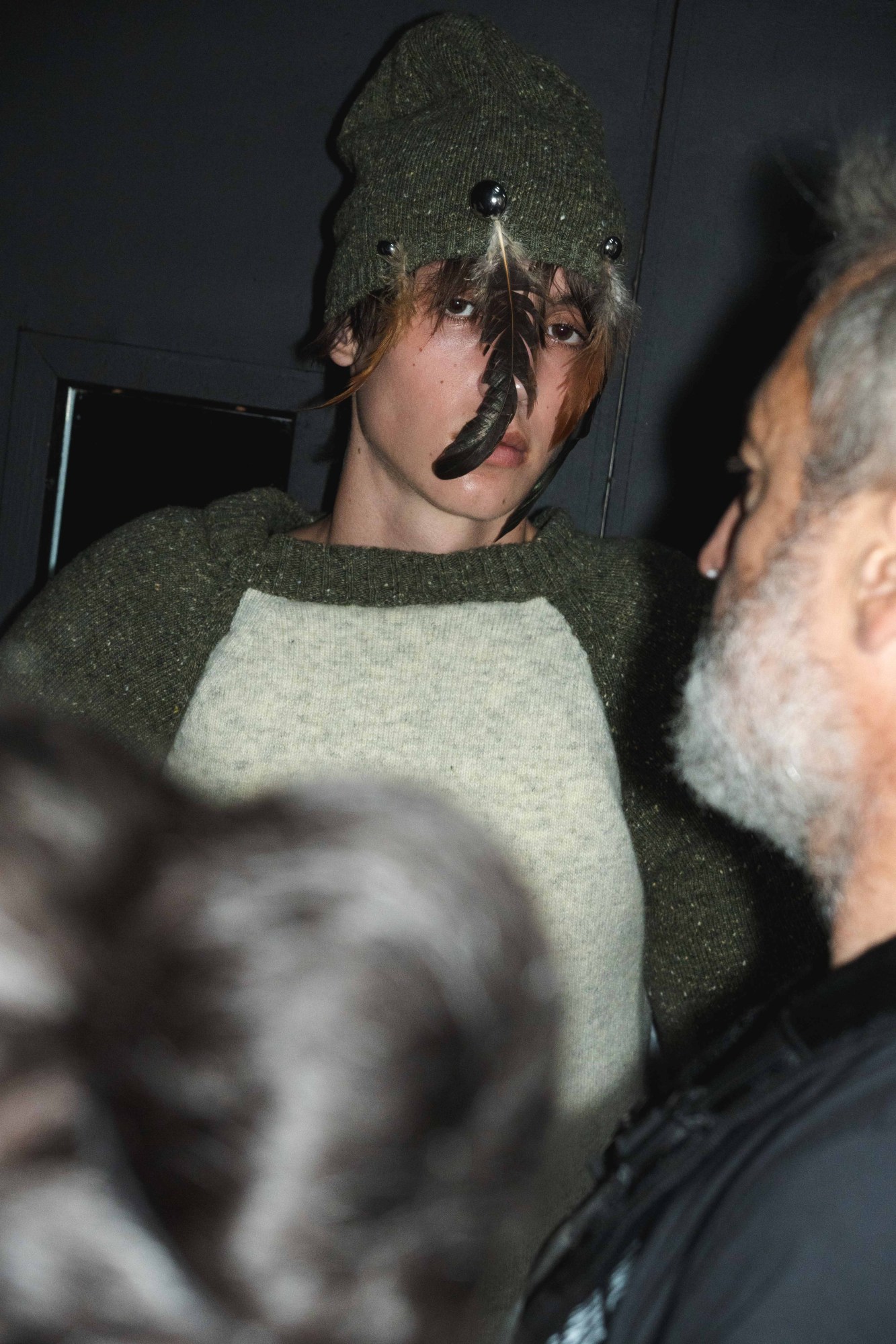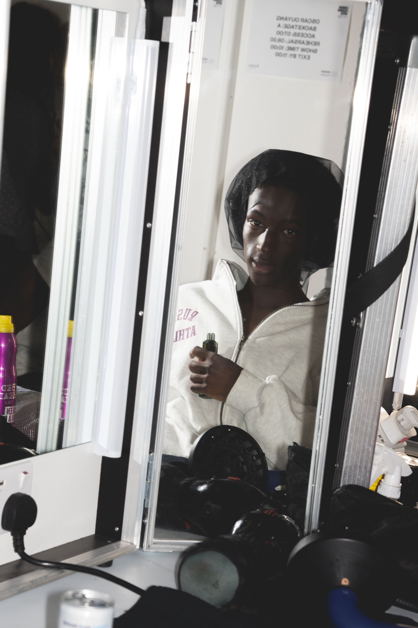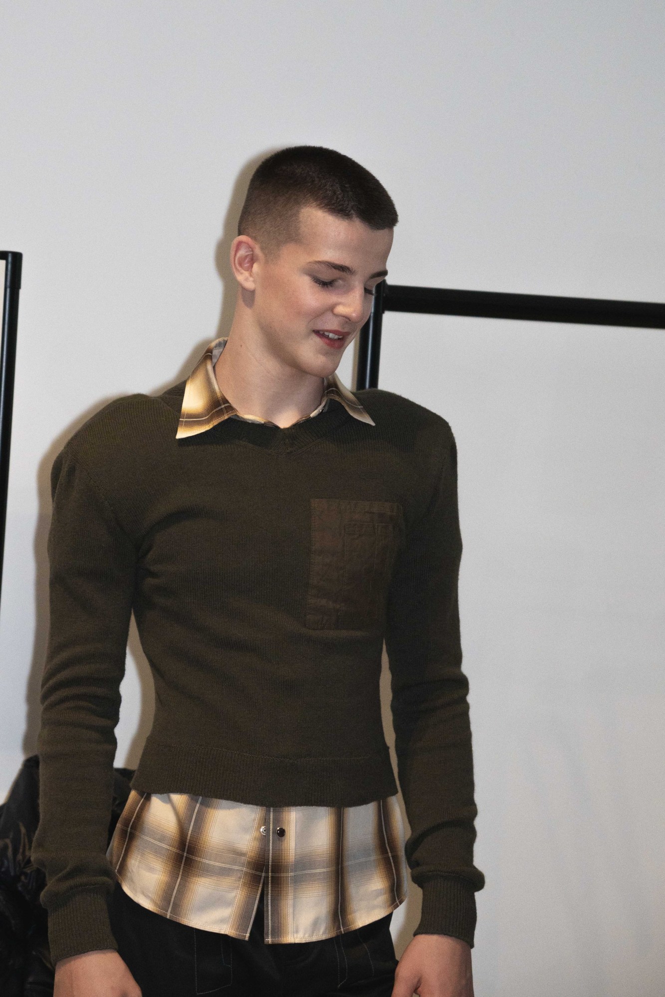 This is Ouyang’s world: grounded in craft, but playful, youthful, and slyly queer. The so-called “Oscar boy” is not one person but a collective character, embodied here by a cast that feels unforced and diverse. Knit raglan T-shirts puff up like couture gym gear, feather embroidery turns everyday fabric into luxury, and showpieces push between boyishness and sensuality without ever being literal.