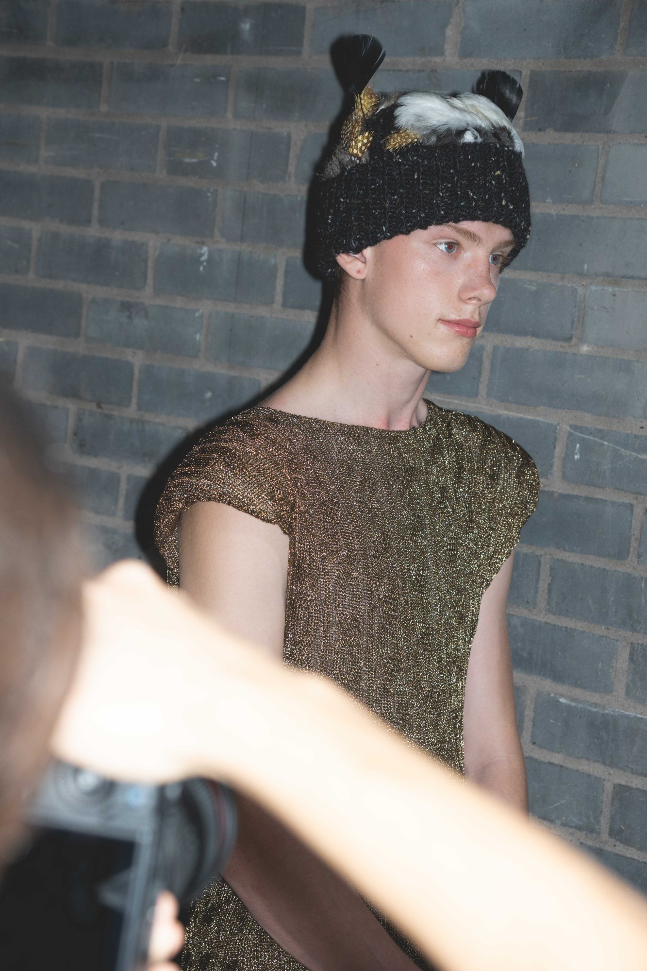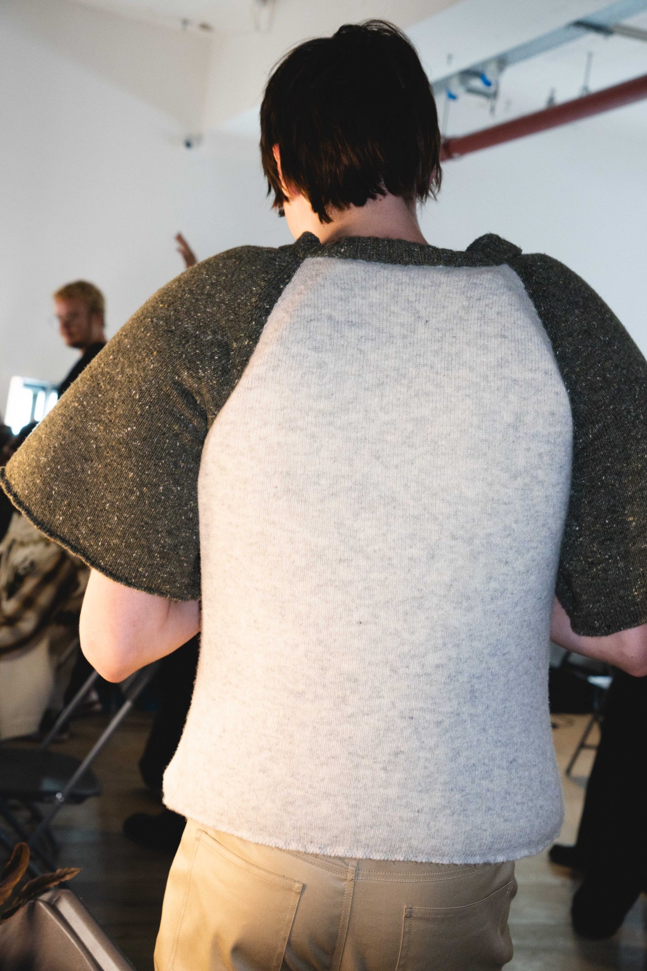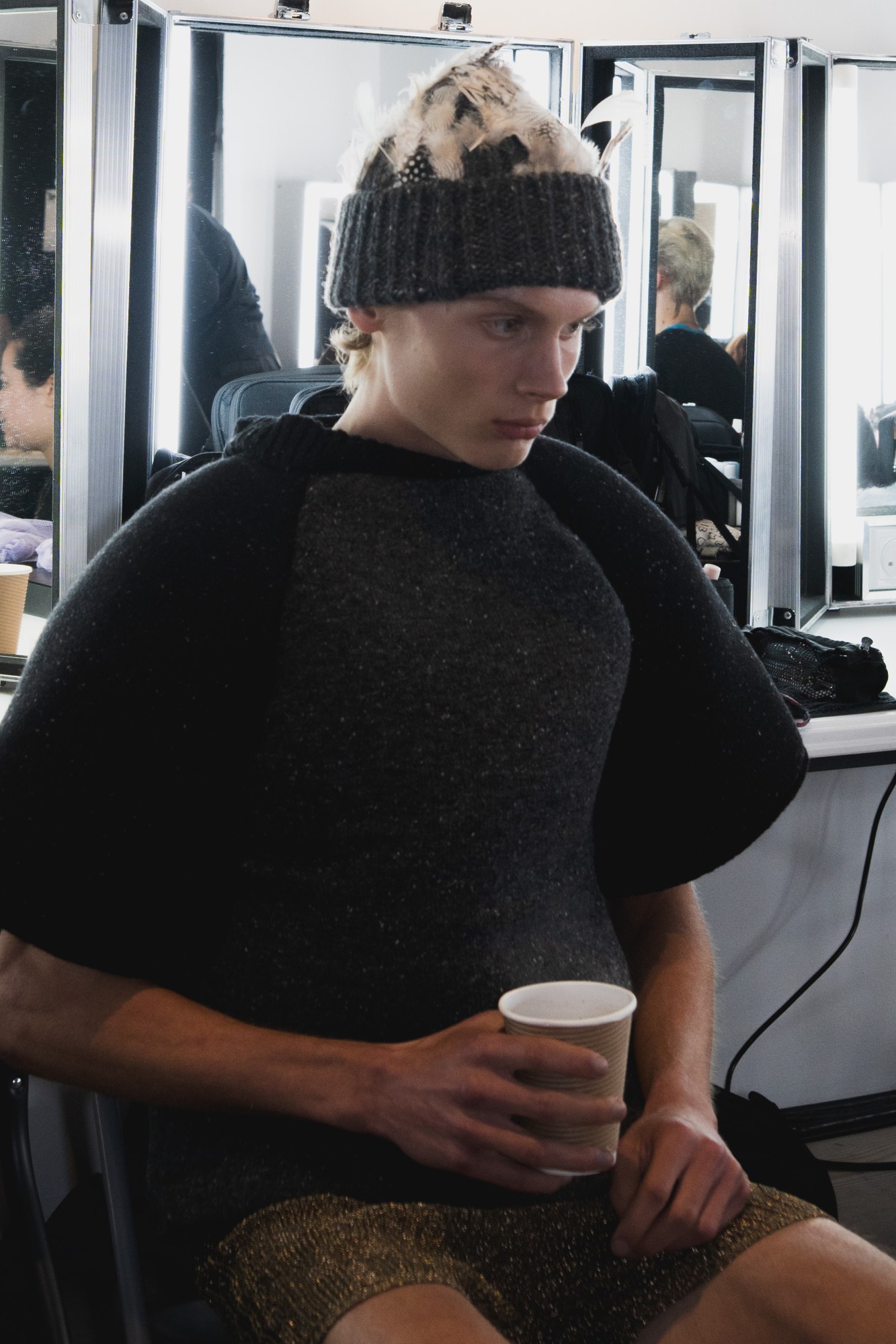 This is Ouyang’s world: grounded in craft, but playful, youthful, and slyly queer. The so-called “Oscar boy” is not one person but a collective character, embodied here by a cast that feels unforced and diverse. Knit raglan T-shirts puff up like couture gym gear, feather embroidery turns everyday fabric into luxury, and showpieces push between boyishness and sensuality without ever being literal.