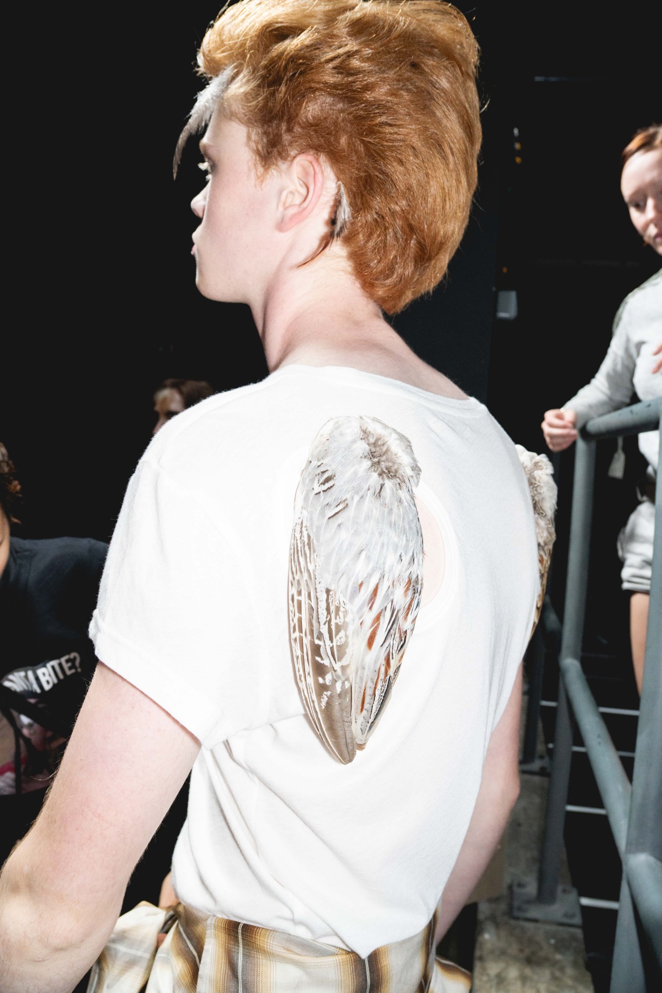 On the runway, that metaphor takes flight. Detachable wings peek from the backs of T-shirts. Feathers, sourced from the meat industry, are embroidered into cotton jersey until they shimmer like couture. A trench coat flashes pistol motifs hidden in its lining. A gold cable-knit dress, shoulders so broad and sharp it could slice the front row, earns audible gasps. Mini shorts stitched from oxford cotton dangle with rusted keys—clever, funny, and a little sexy. “Every piece is wearable,” Ouyang explains. “Even the simplest jumper has something—cut, a cuff, a neckline—that makes you look twice.”