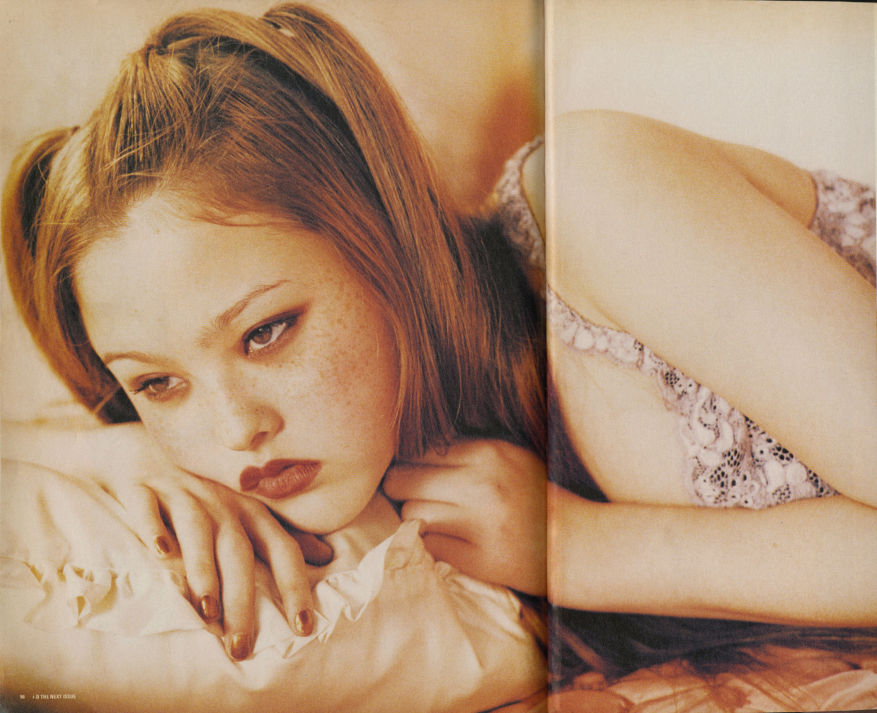 Devon Aoki, the muse, the dream, the GODDESS. With the face of an angel, she’s Karl Lagerfeld’s bride, Jeremy Scott’s mermaid and Sin City‘s deadly mute assassin. Here she is all baby-innocence, pigtails and pillows, age 14 in The Next Issue, No. 168, September 1997.