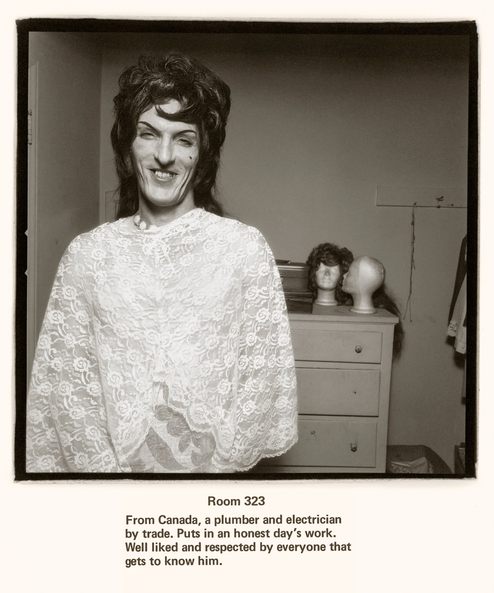 In Room 323, a plumber and electrician welcomed Penny with a warm smile and a photo ready look, breaking out her gown and lace wrap for the portrait. During the day, Jean presented as a man, wearing overalls and carrying tools of the trade, but after retiring to her boudoir, she was free to live her truth. “Jean was a beautiful person,” Penny recalls. “At the hotel, nobody batted an eye. Jean was an original who lived an authentic life.”