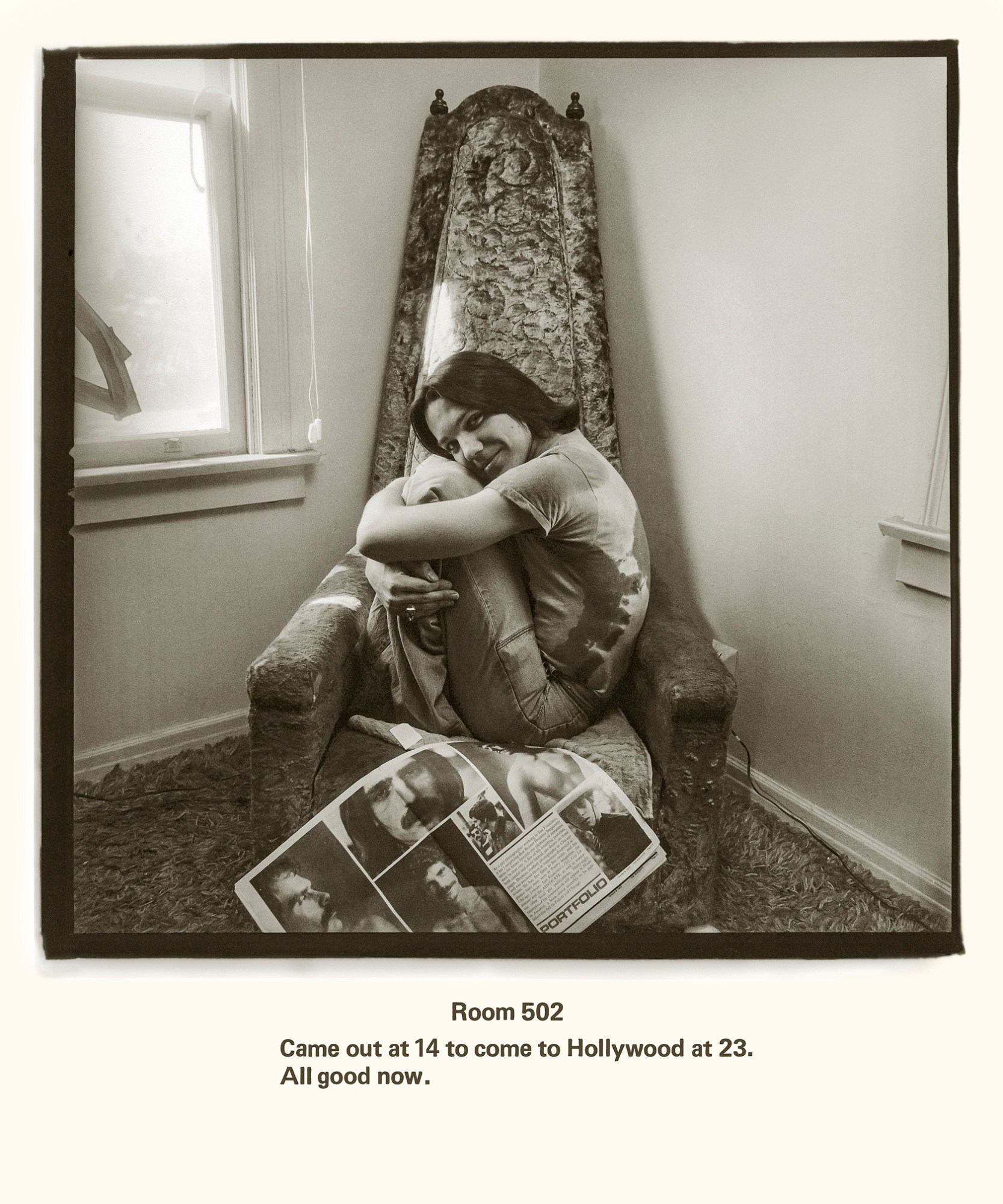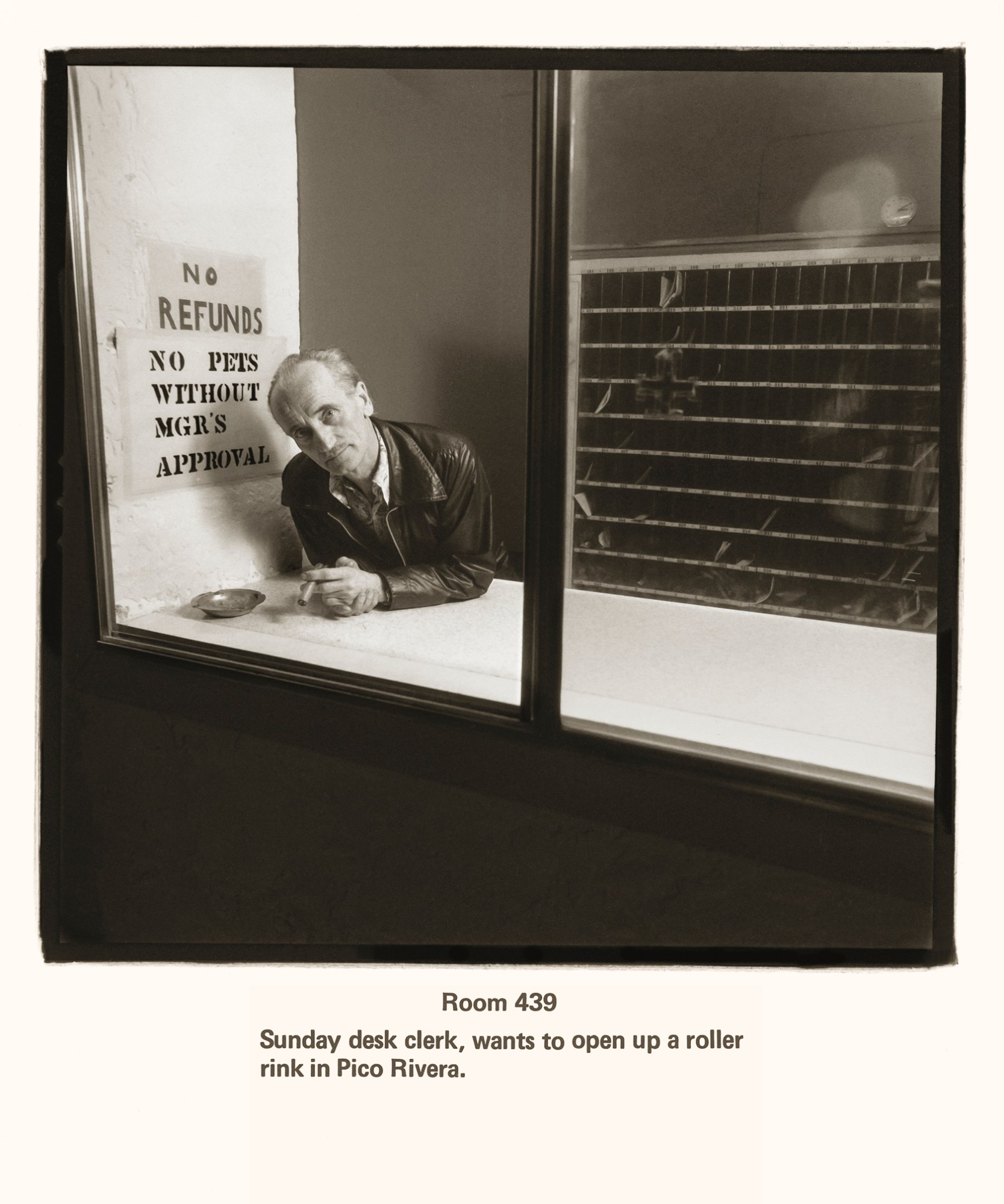 Her first encounter with a former Hollywood stuntman living in Room 105 proved to be a singular event, defining the need to make these portraits. “I met him in the lobby and he was very amenable to me photographing him,” she recalls. “He wanted me to come early in the morning, probably eight o’clock. When I got here, the police were there. He had died the night before. His body had already been removed. This was a wake up call.”