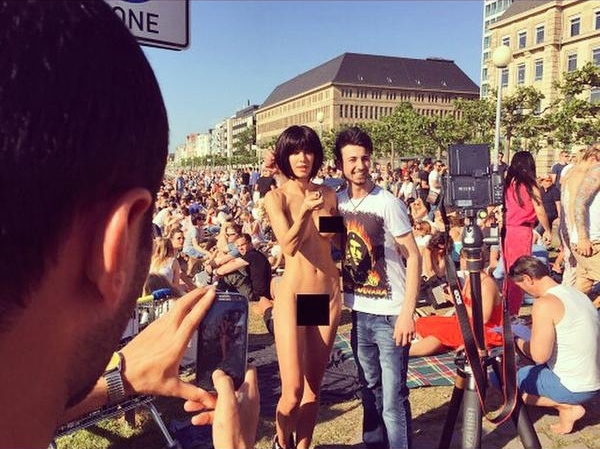Swiss performance artist Milo Moiré got naked at Art Basel, again. From when she dropped paint-filled eggs out of her vagina to her attempted naked entry into last year’s Art Basel, Moiré continuously challenges the art world. During the second day of Art Basel’s VIP previews and a few minutes away from the main venue, Moiré performed her latest, pretty self explanatory piece: Naked Selfie. Moiré set her camera on a tripod and undressed—leaving only a pair of pink running sneakers. She then stood in front of the camera waiting for someone to take a #selfie with her. Unsurprisingly, all of the selfies were taken with men, most of them posing with a predictable thumbs up.