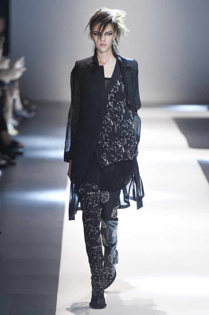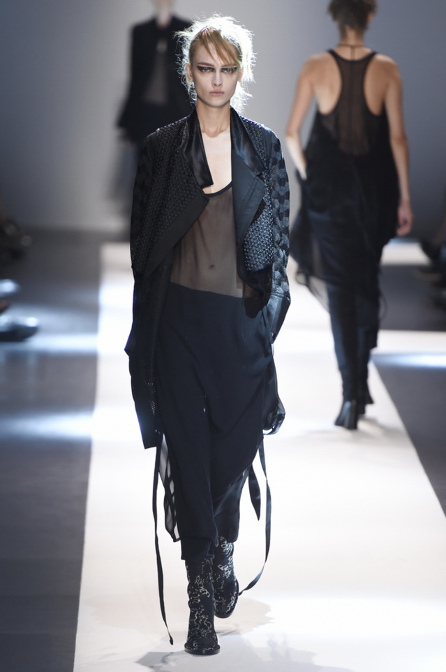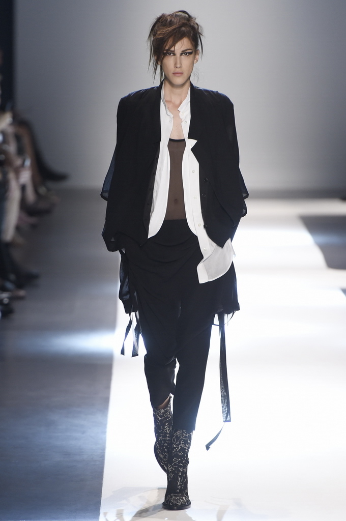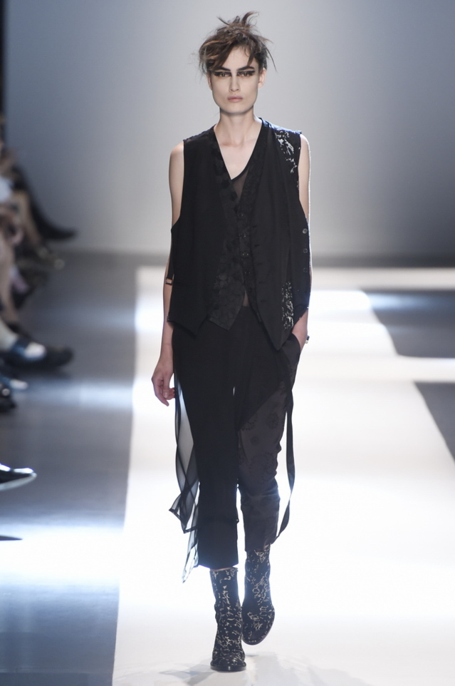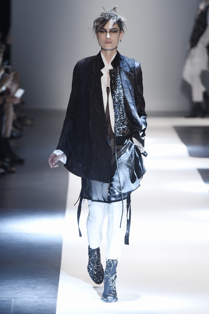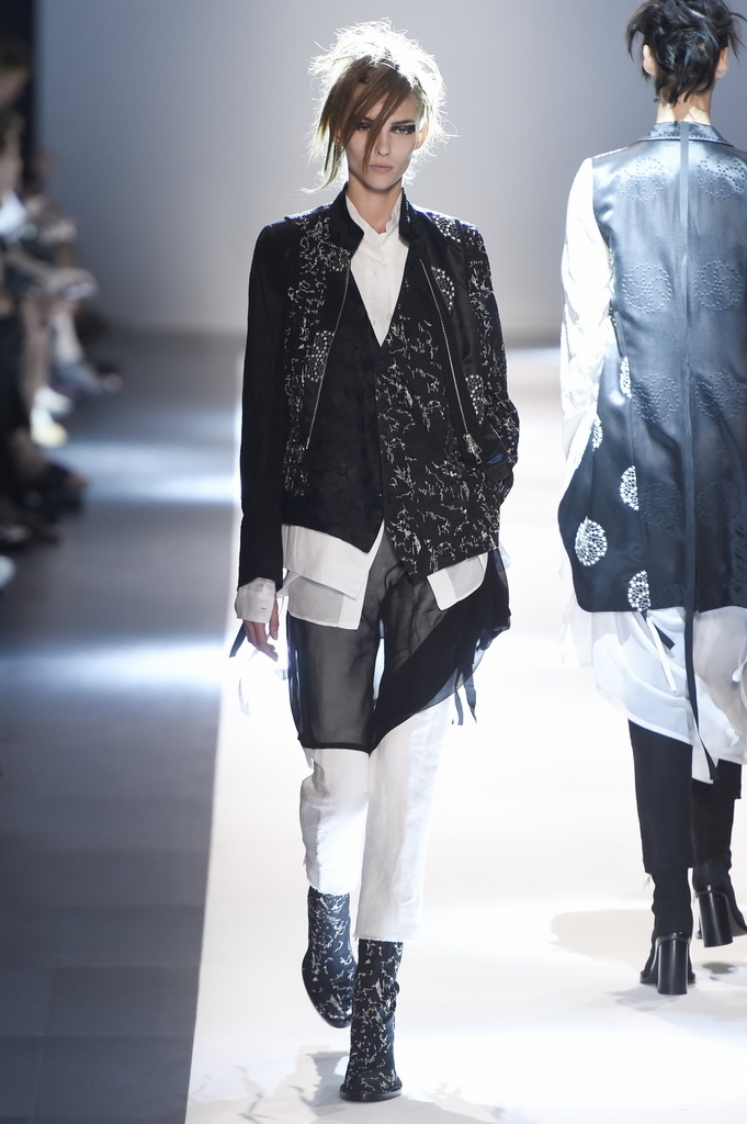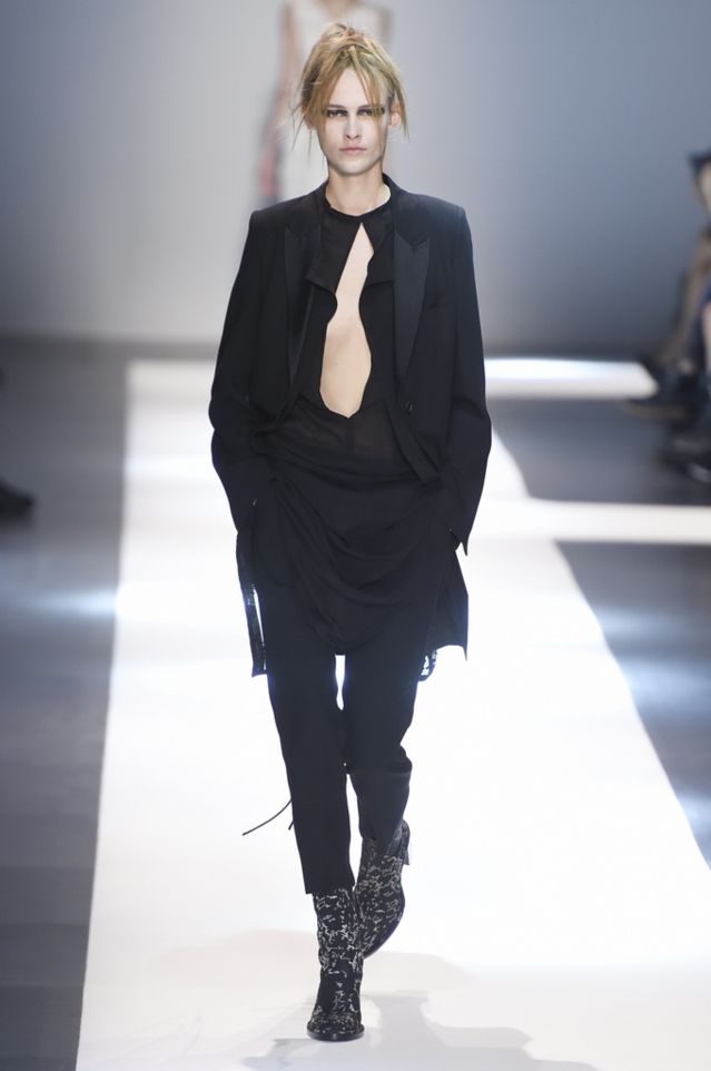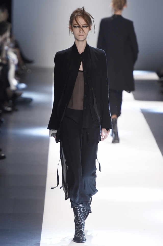 Oh, Ann. Where are you these days? Are you well? Are you taking long walks on the autumn beach by your summer house, watching the birds, the trees; taking in the serenity? The great D-Meister may have left us but a year on, her legacy is very much alive thanks to Sebastian Meunier, who had placed little black and white feathers on everyone’s chairs at Thursday’s show as an homage to the house’s founder, who could change an entire outfit with the clever touch of a single feather. Oh, Ann, we miss you. That’s why Meunier’s undertaking at the house of Demeulemeester isn’t an easy one: Ann was quite the poet in her work, and it’s something so personal it could never be imitated.
