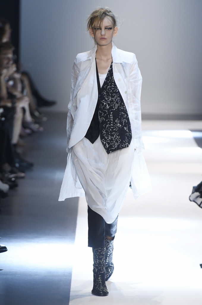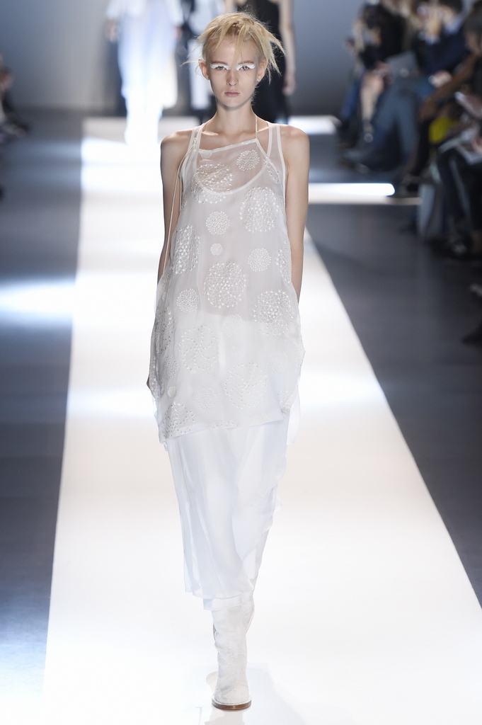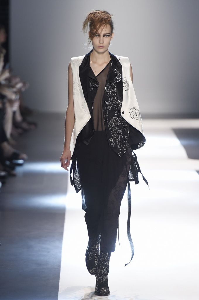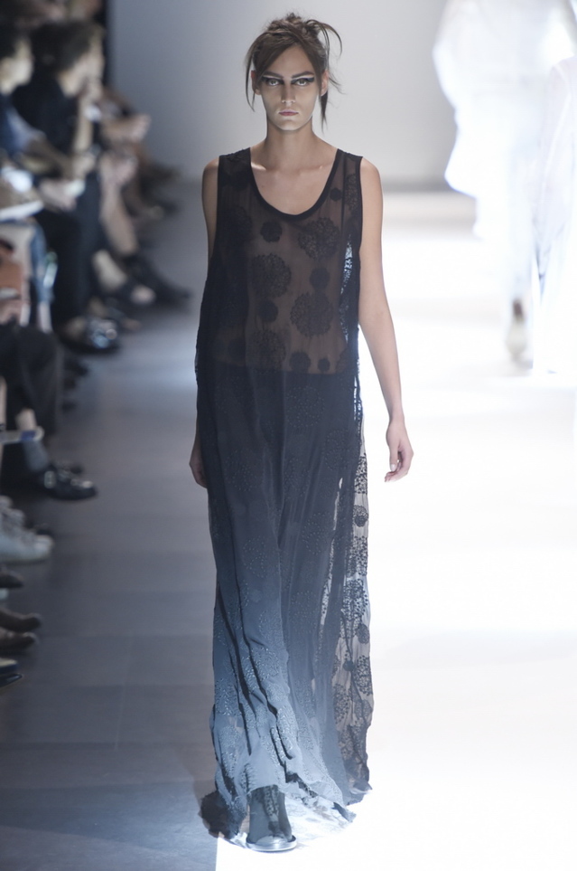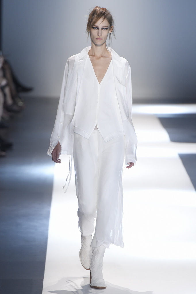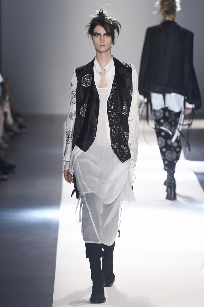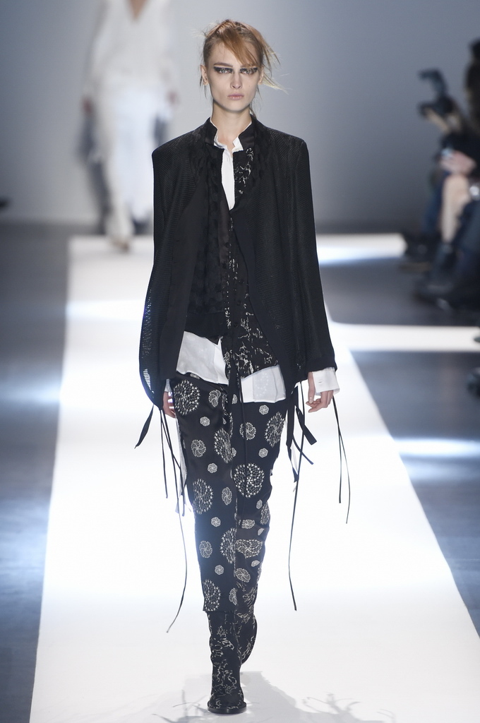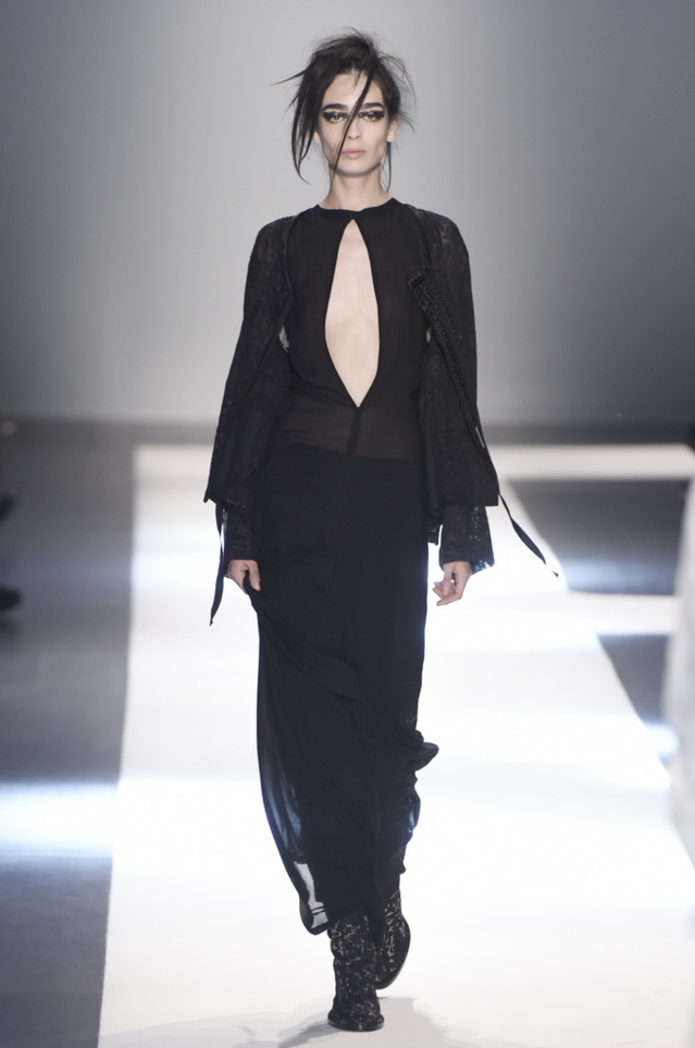 Oh, Ann. Where are you these days? Are you well? Are you taking long walks on the autumn beach by your summer house, watching the birds, the trees; taking in the serenity? The great D-Meister may have left us but a year on, her legacy is very much alive thanks to Sebastian Meunier, who had placed little black and white feathers on everyone’s chairs at Thursday’s show as an homage to the house’s founder, who could change an entire outfit with the clever touch of a single feather. Oh, Ann, we miss you. That’s why Meunier’s undertaking at the house of Demeulemeester isn’t an easy one: Ann was quite the poet in her work, and it’s something so personal it could never be imitated.