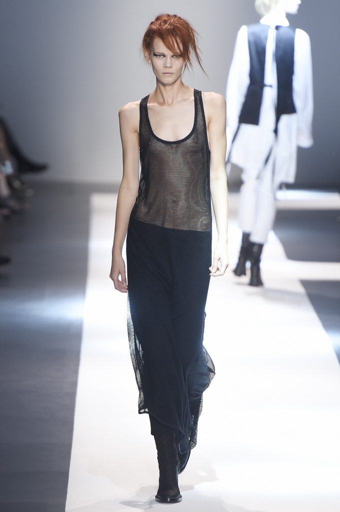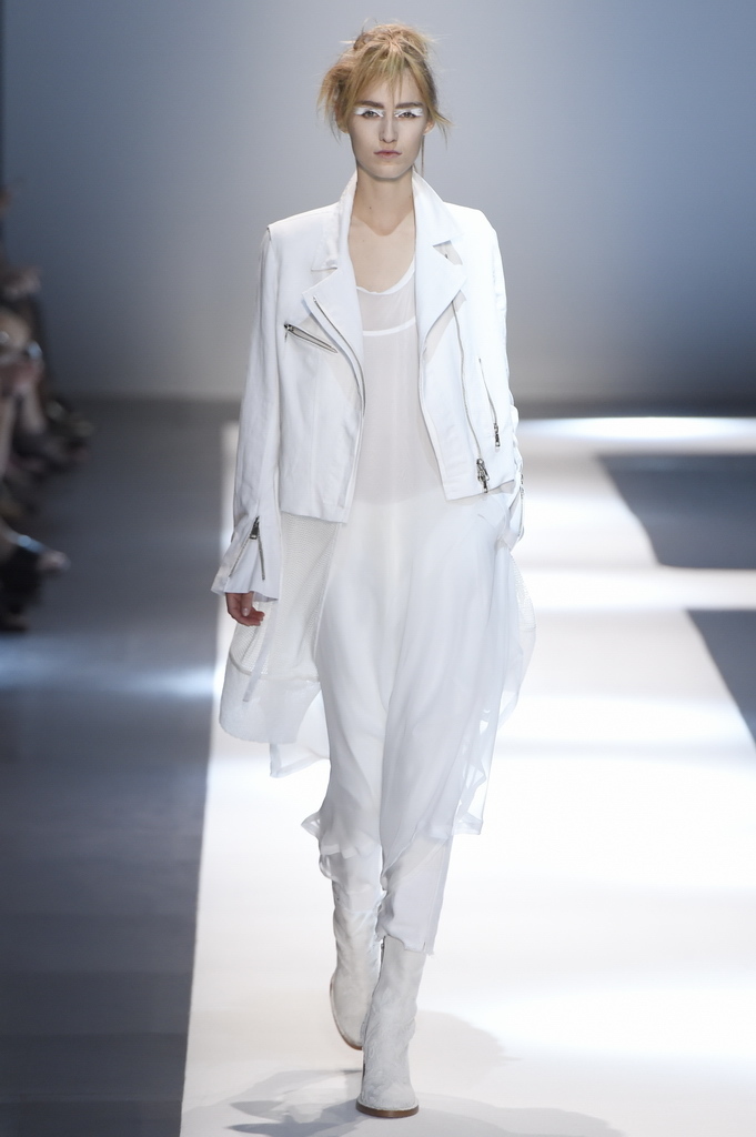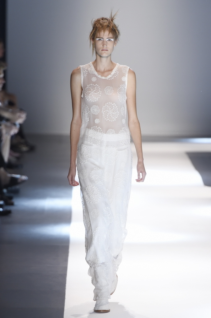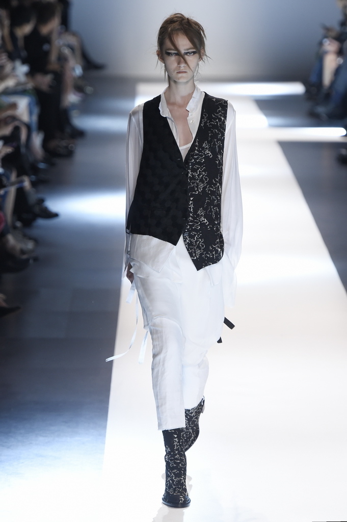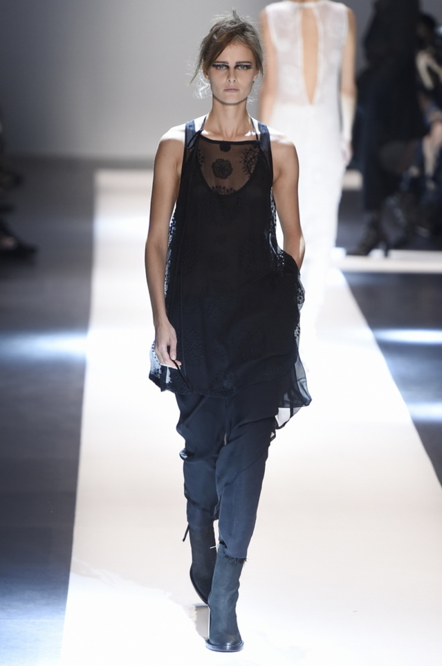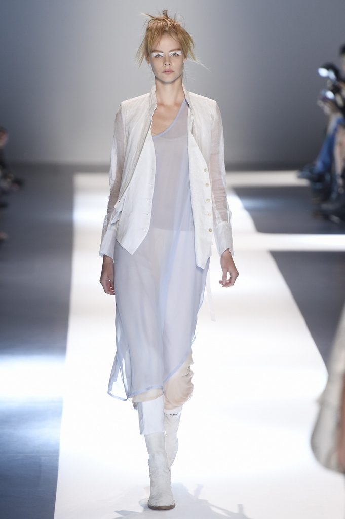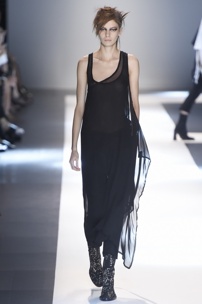 Oh, Ann. Where are you these days? Are you well? Are you taking long walks on the autumn beach by your summer house, watching the birds, the trees; taking in the serenity? The great D-Meister may have left us but a year on, her legacy is very much alive thanks to Sebastian Meunier, who had placed little black and white feathers on everyone’s chairs at Thursday’s show as an homage to the house’s founder, who could change an entire outfit with the clever touch of a single feather. Oh, Ann, we miss you. That’s why Meunier’s undertaking at the house of Demeulemeester isn’t an easy one: Ann was quite the poet in her work, and it’s something so personal it could never be imitated.