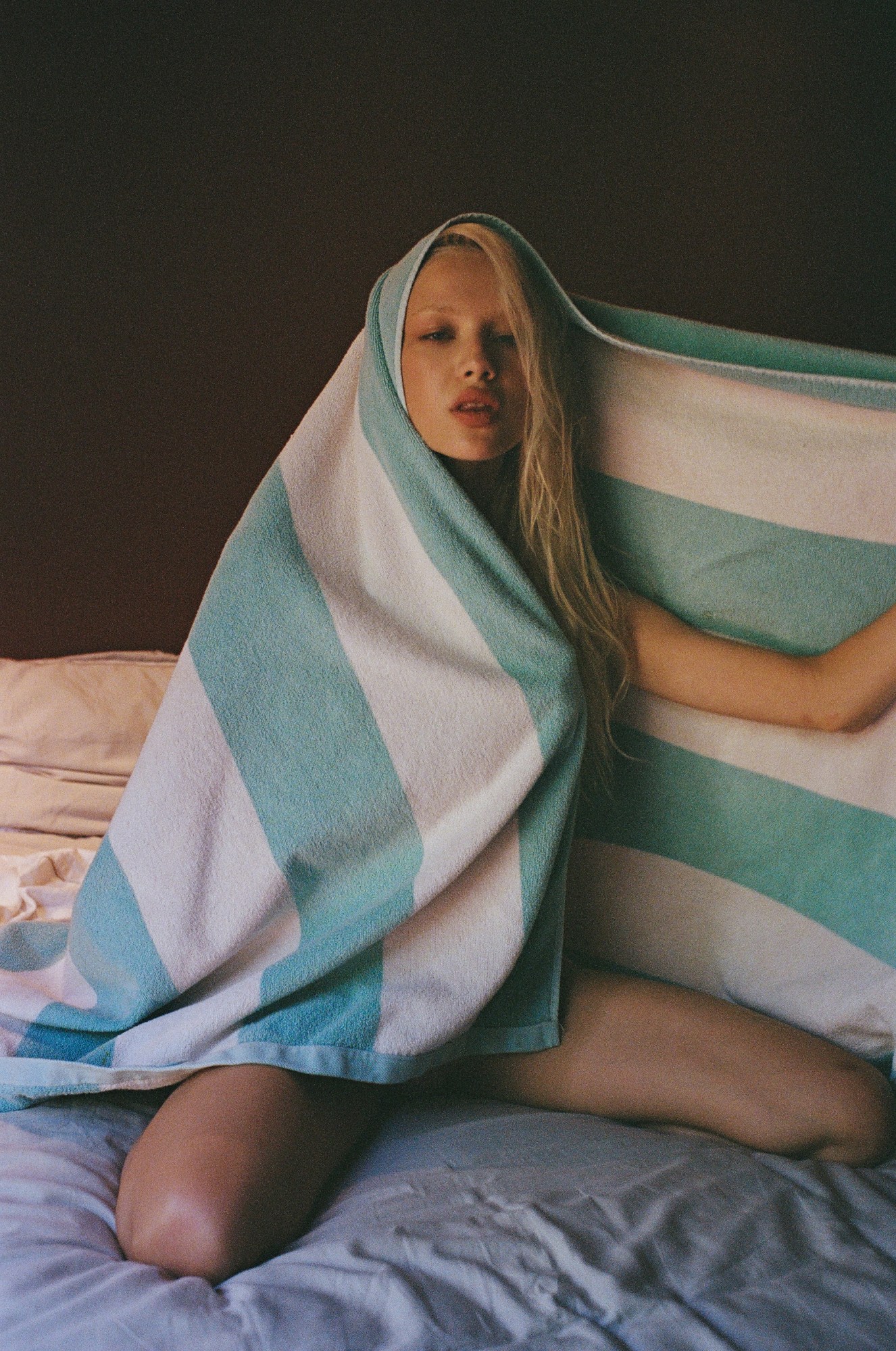 a woman wrapped in a blue and white towel on a bed looking into the camera. she is blonde.