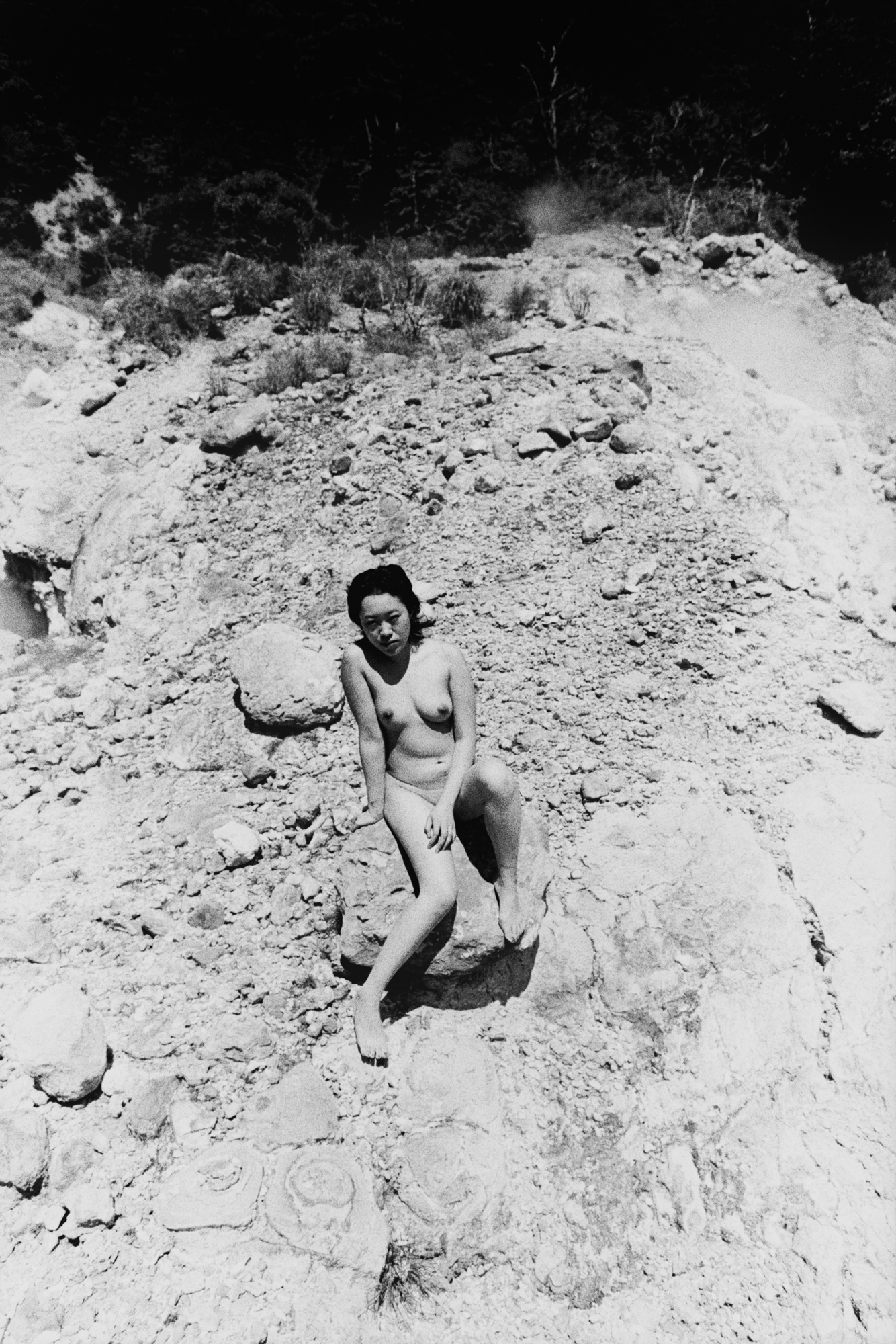Black-and-white image of a naked woman sitting on the ground at a Japanese wild hot spring