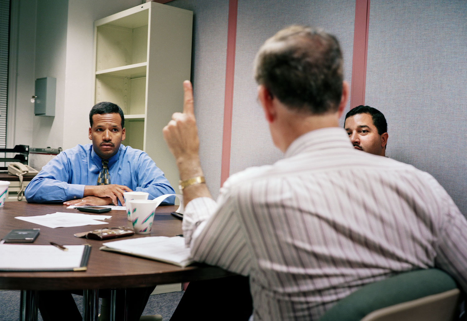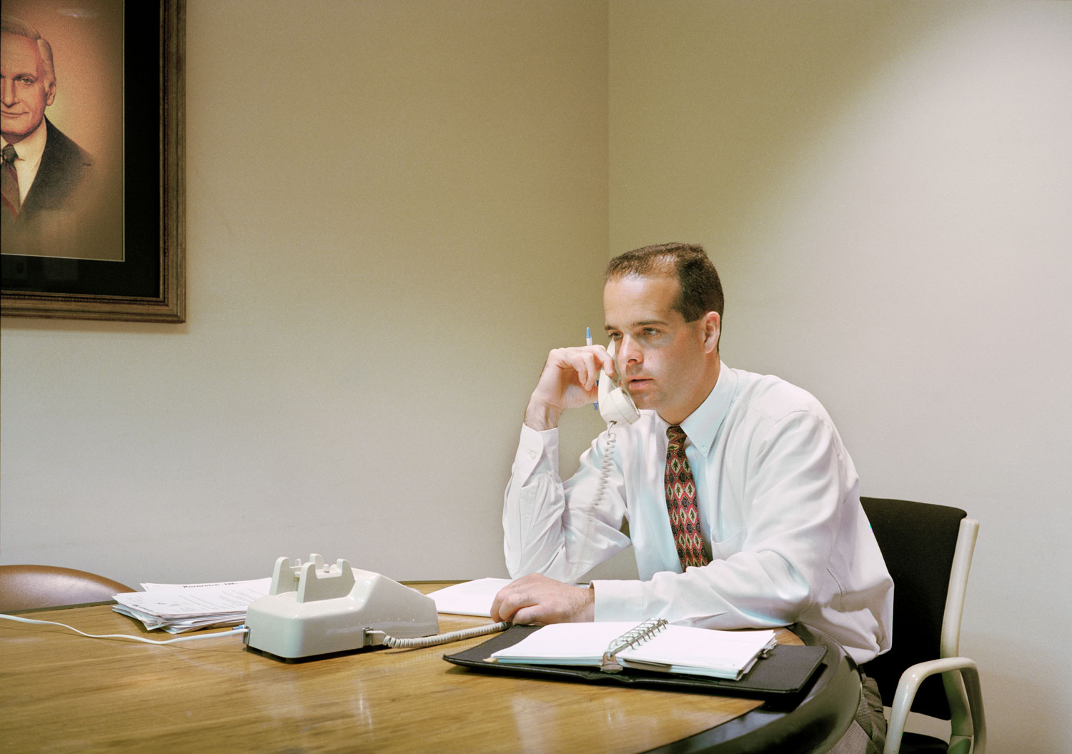 Shot in the buildings of insurance and loan companies, law firms and online magazines in Virginia, Massachusetts and Silicon Valley, the pictures were all taken between 1990 and 2001. Featuring white boards, heavy desktop computers and metal filing cabinets, there’s little to differentiate between the types of work going on. Similarly, the people occupying each frame are largely white men dressed in shirts and ties.