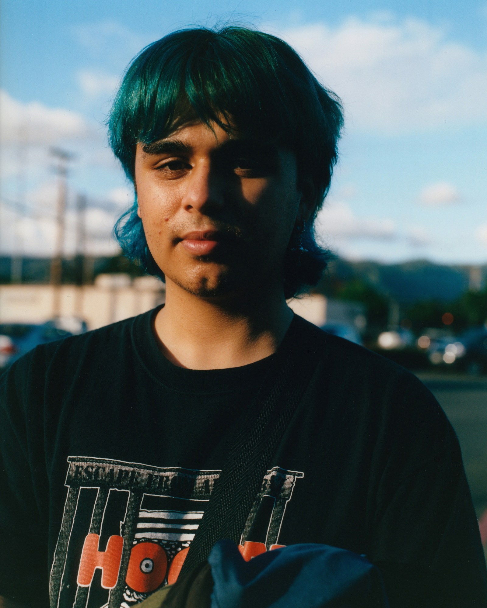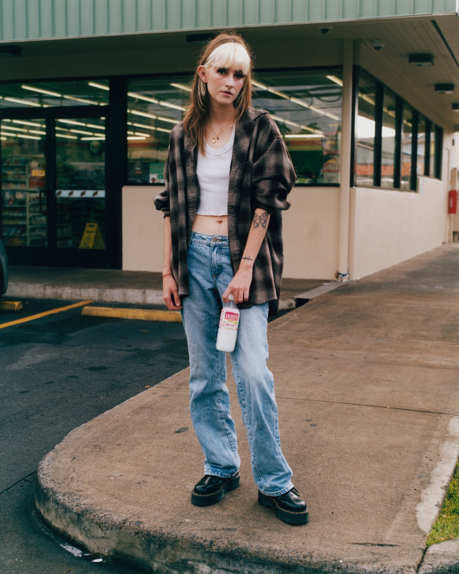 Take, for example, Brandon Santos, who goes by the pronouns they/them, a subject of one of Maxime’s photographs. In their portrait for Hawaiian Youths, the 22-year-old Brandon poses in front of a 7-Eleven convenience store with the popular Japanese drink, Calpico, in hand. With their platinum blonde fringe and grunge-inspired aesthetic, they are a far cry from the beach babe cliché most associate with the islands. And yet, Brandon has experienced a life that is quintessentially Hawai’i: battling rising rent prices and struggling with the high cost of living.