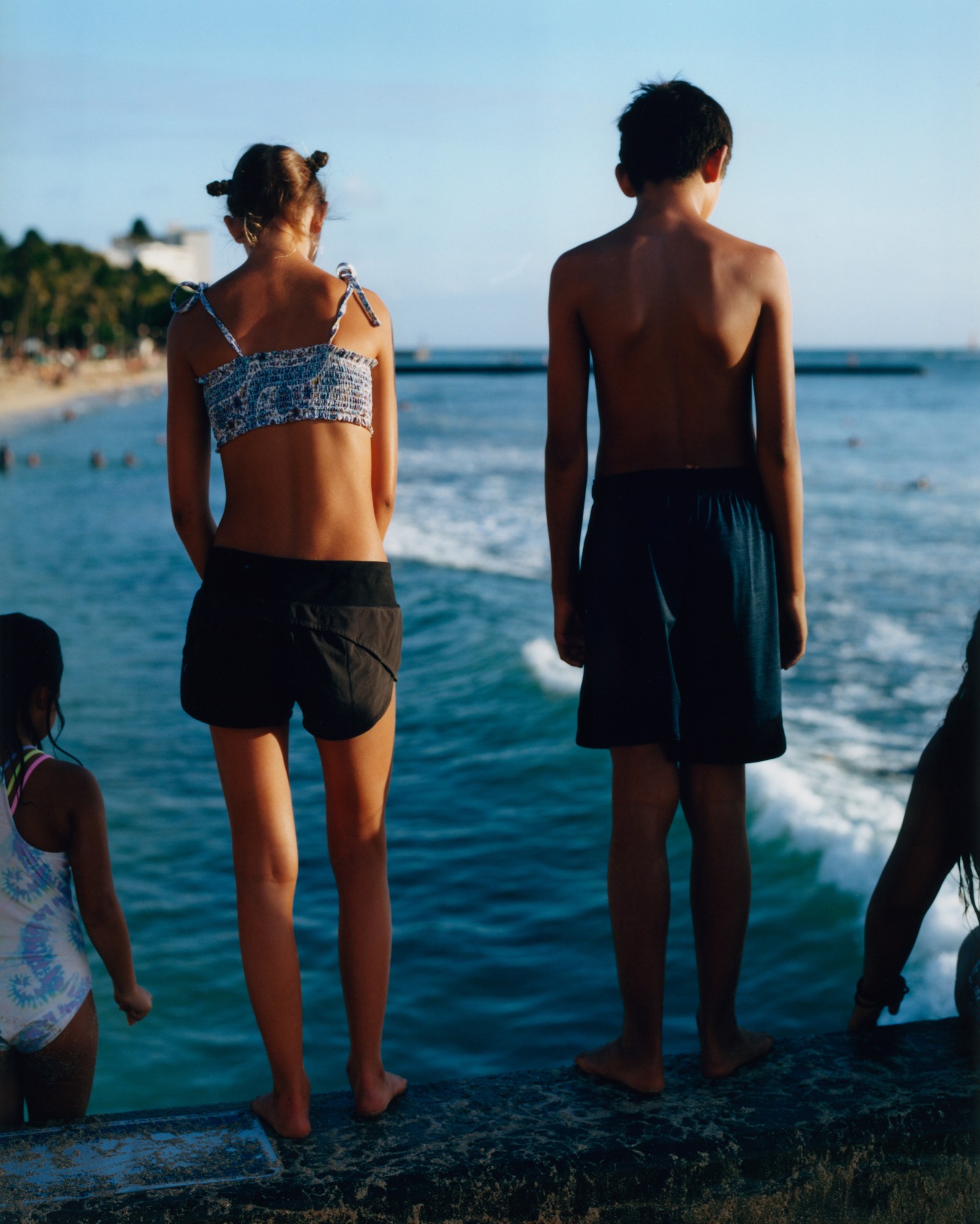 In one of the most poignant images in Hawaiian Youths, two local kids stand on the precipice of a stone pier. Beyond them, turquoise waves lap up against the shore, and beachgoers dot the horizon. It’s a typical day in Hawai’i nei. Yet Maxime’s framing paints the kids as something more symbolic, perhaps even prophetic. Are they on the verge of jumping, pushed off the islands like so many locals before them? Or are they sentinels at the border, Hawai’i’s next generation standing guard to protect the only home they’ve ever known?