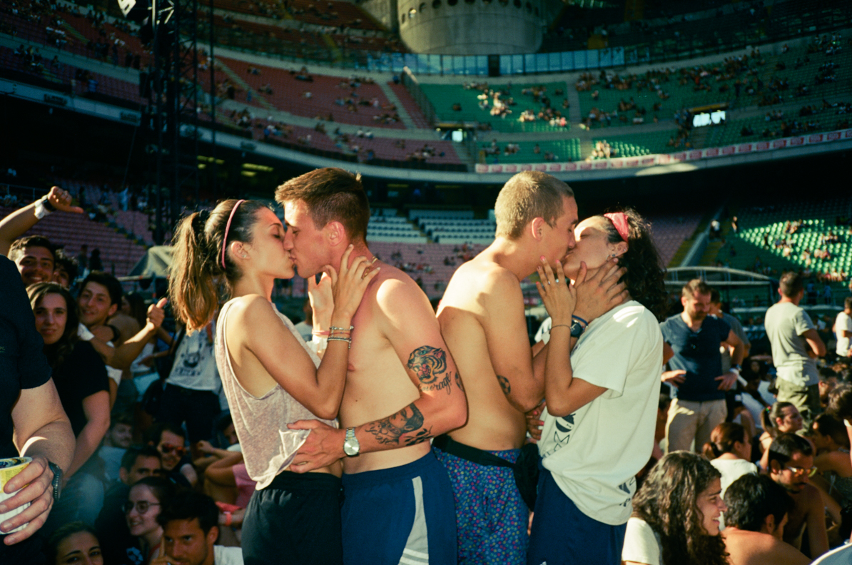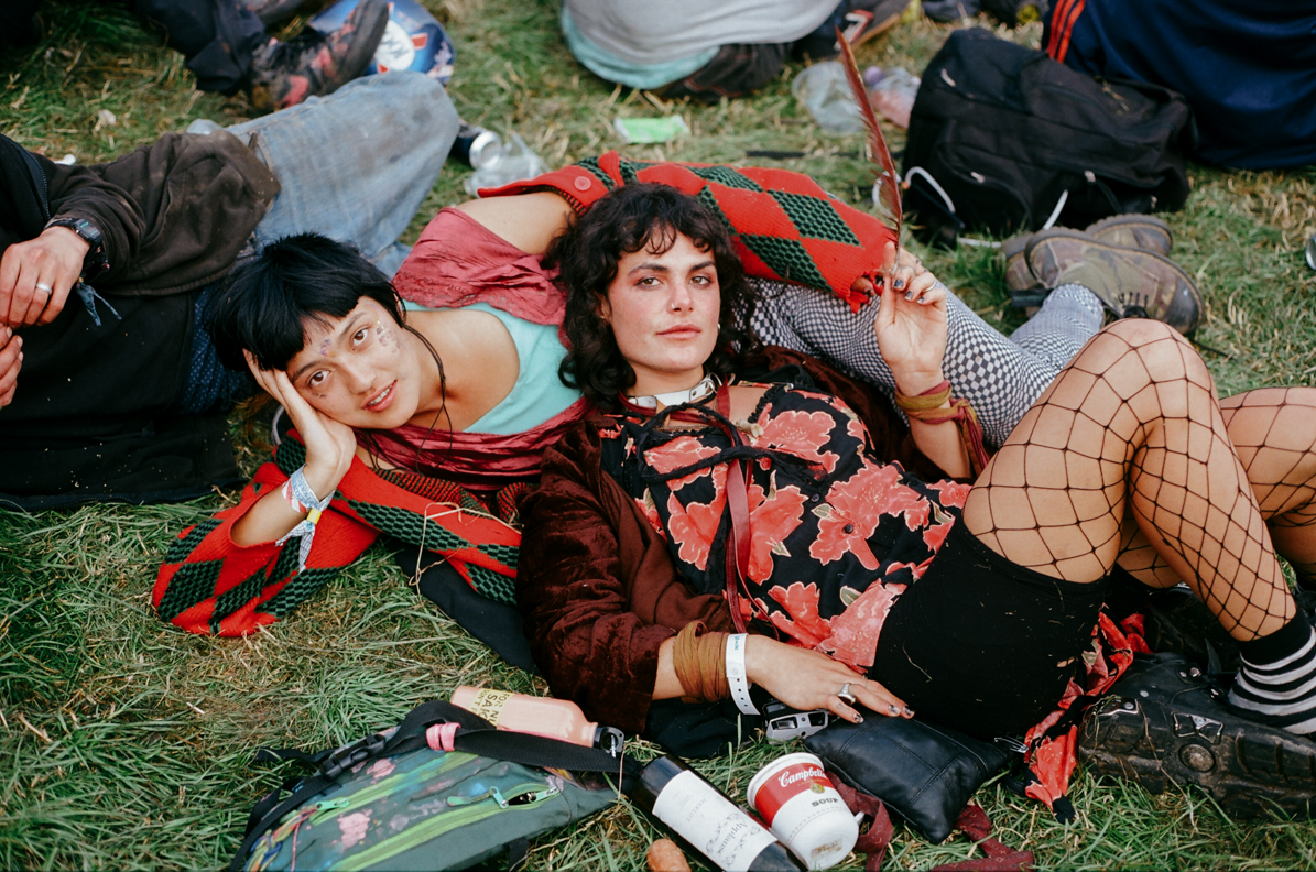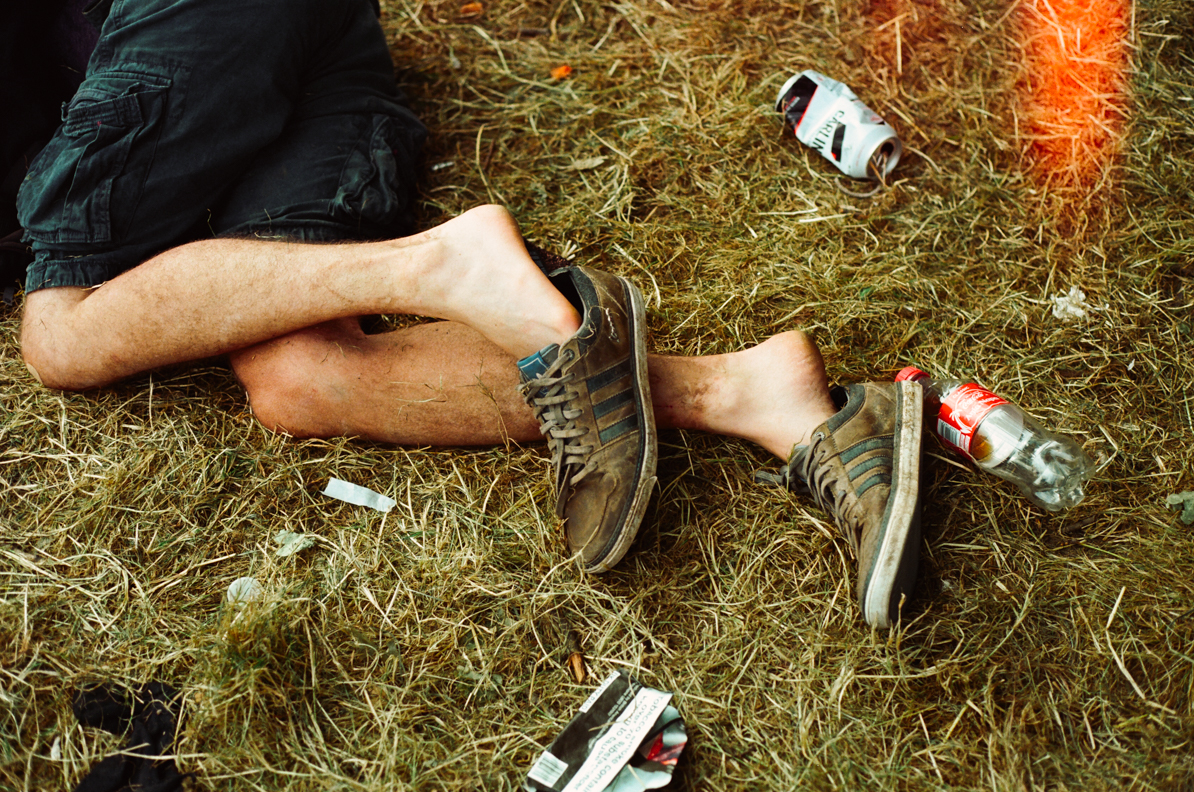 In the book, music fans, or, fanatics, come across green and excited, while others appear wildly unhinged. Edited like a 24-hour festival experience, the photographs move from the morning through to the middle of the day, with people waving cardboard signs scrawled with the name of the festival they hope to hitchhike to, then arriving bright-eyed and bushy-tailed. They slowly deteriorate into chaos as they enter a nighttime full of sweat, snogs and scrapes. With the hardcore ravers ultimately waking up in fields, entangled with strangers or covered in makeshift newspaper blankets.