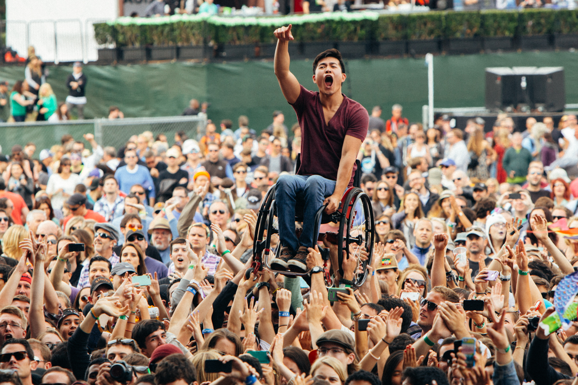A very powerful photograph in the book features Marcus’s friend Ryan Chen, being hoisted in his wheelchair above a sea of fans at Austin City Limits in Texas. At the same time, the crowd shouted the Young The Giant lyrics: “My body tells me no, but I won’t quit/ Cause I want more.” In the photo’s caption, the band’s lead singer Sameer Gadhia says that they wrote the song when they were just 18 years old, and never really knew what it meant until that moment. “[Ryan’s] love for life, his desire to grow and face each challenge with grace and determination, and his undying passion for all experiences have become sources of infinite inspiration for me.”