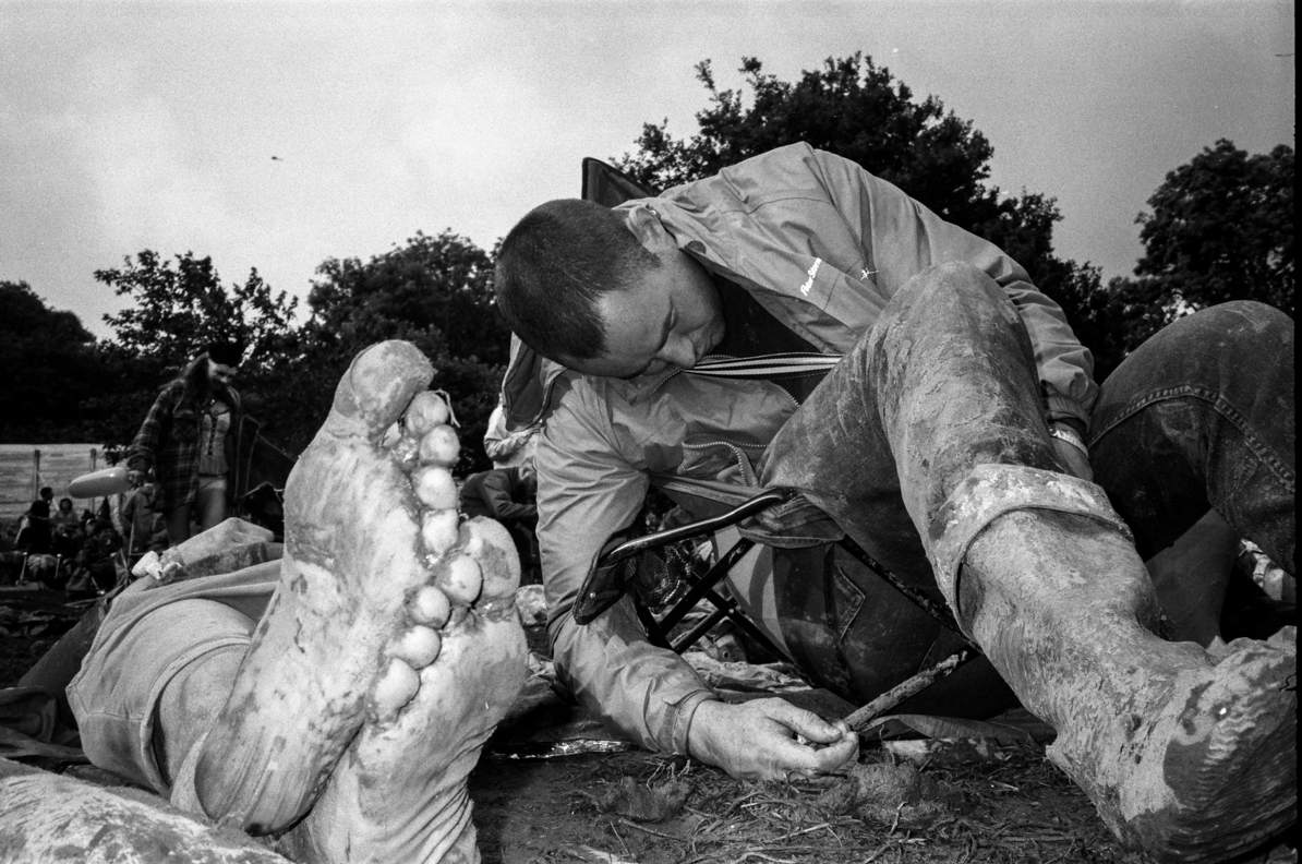 Baking in the heat, grubby and sleep-deprived, but having the best time ever — Marcus captures the indomitable spirit of these fans in small, spontaneous moments. You can tell from the photographs that he’s in the dirt with them, enjoying every single minute of it. Because, he says, “Where else, in public, do you find such personal experiences all communally shared at the same time and people being so vulnerable?”