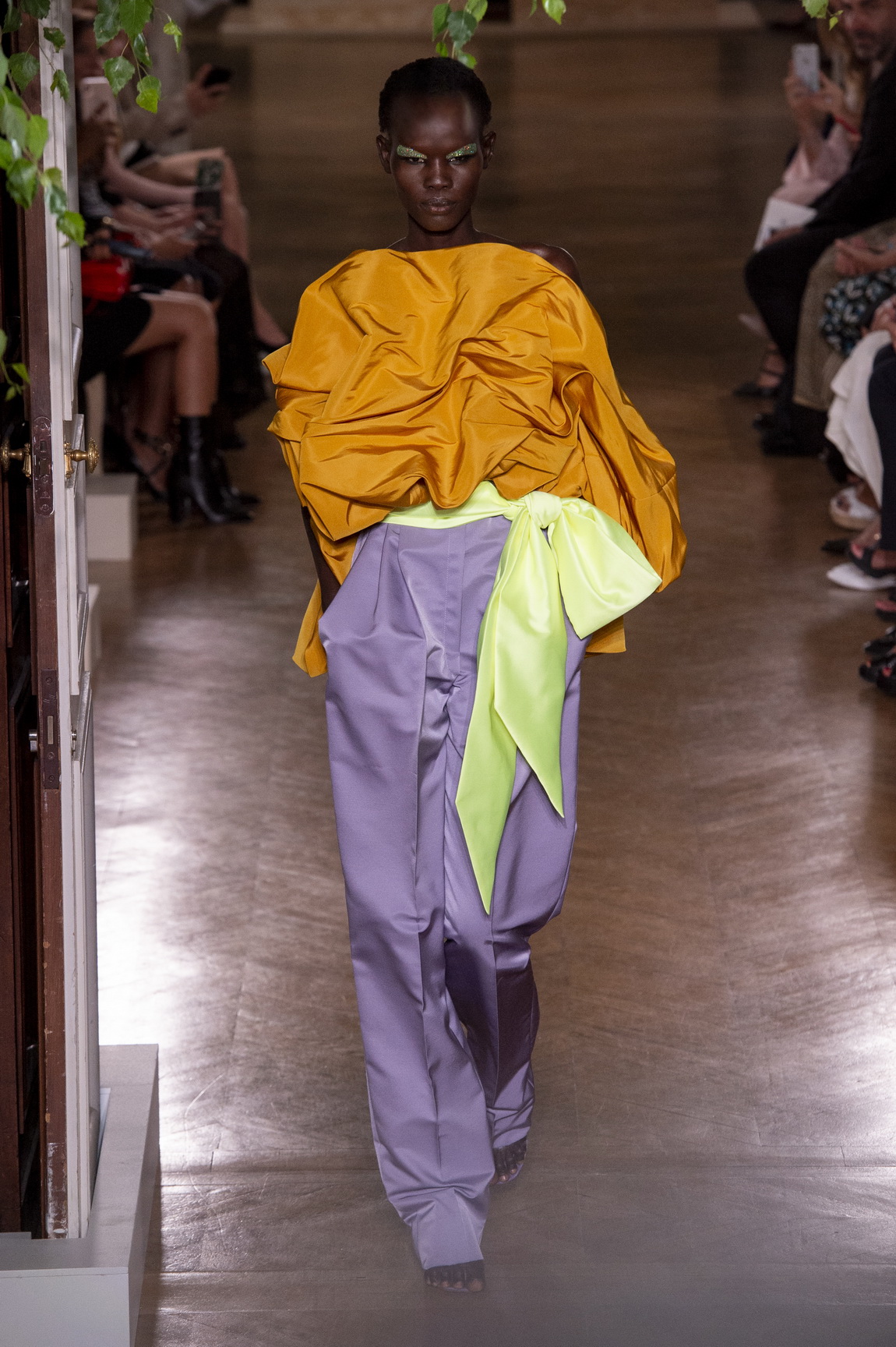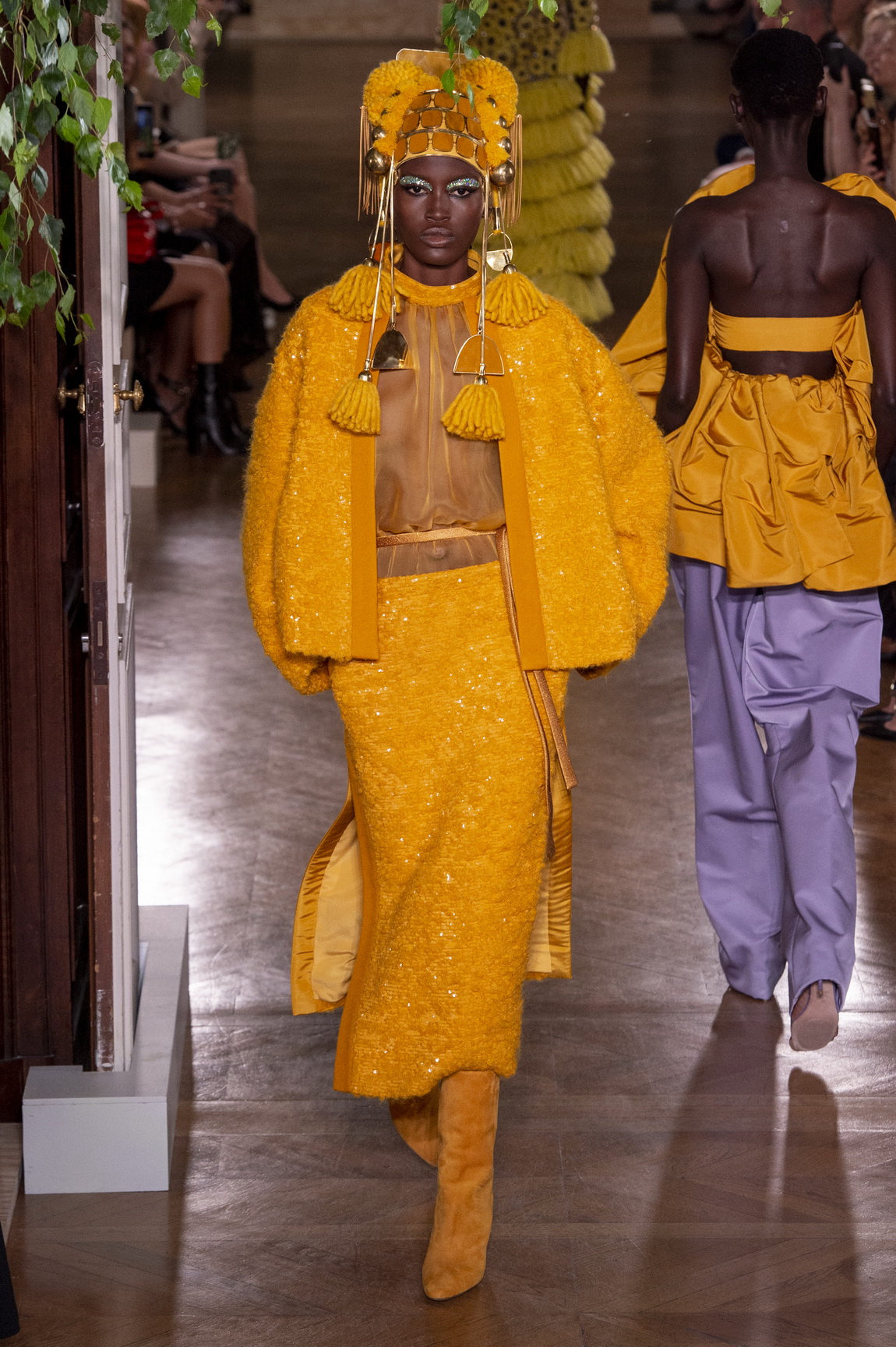 Last summer, the pink ostrich-feather dress Kaia Gerber wore in the couture show arguably ignited a frenzy for feathers, resulting in every couture house (and plenty of ready-to-wear designers) seemingly stitching together flocks of the stuff. Pierpaolo, however, has moved on. In the place of plumes, he opted for woolly komondor tassels and fringing, which have a homespun, shaggy quality. Well, not so shaggy in the hands of Valentino’s petite mains. Here it was dyed in saturated hues and used as trims, headpieces and there was even a splendid lemon-hued gown entirely crafted from it, with sequins transforming the bodice into mini flowers — worn by Anok Yai to open the show.