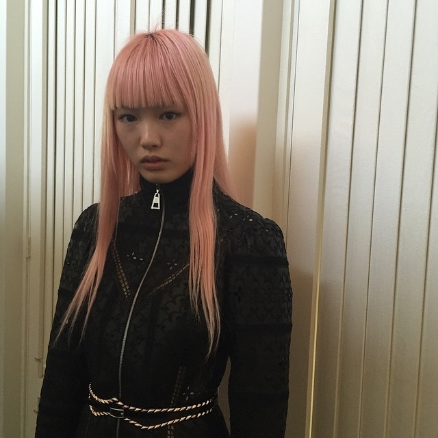 While they’re often associated with punk and grunge (think Kurt Cobain and L7), pink locks also have a long history as a signifier of feminine beauty. In 1937, the legendary European hair stylist Leo of Vienna told the Associated Press that pink hair was perfect for formal events “because women, at evening, should always look flower-like.” Maybe it’s that balance of tough and soft, wild and romantic, that makes cotton candy-colored hair a recurring guest on the runways. Inspired by how ethereal Fernanda Ly — Nicolas Ghesquière’s model of the moment — looked at his recent Louis Vuitton Resort 2016 extravaganza in Palm Springs, we rounded up some of our favorite pink hair appearances, from Chloe Norgaard at Rodarte to Kate Moss in 90s Versace.