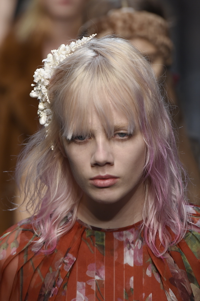 Alessandro Michele’s first women’s ready-to-wear collection for Gucci this past February had the #frow on the edge of their seats, and the designer didn’t disappoint. Weaving 70s throwbacks in with the fashion house’s more traditional Italian tailoring, he softened buttoned-up looks with grunge-inspired pink hair. “Alessandro really loved Courtney Love’s look when she was in Hole and had two-toned hair,” explained stylist Paul Hanlon. Hanlon dyed Linn Arvidsson and Marjan Jonkman’s tips with Crazy Color and then washed it out for a faded effect.