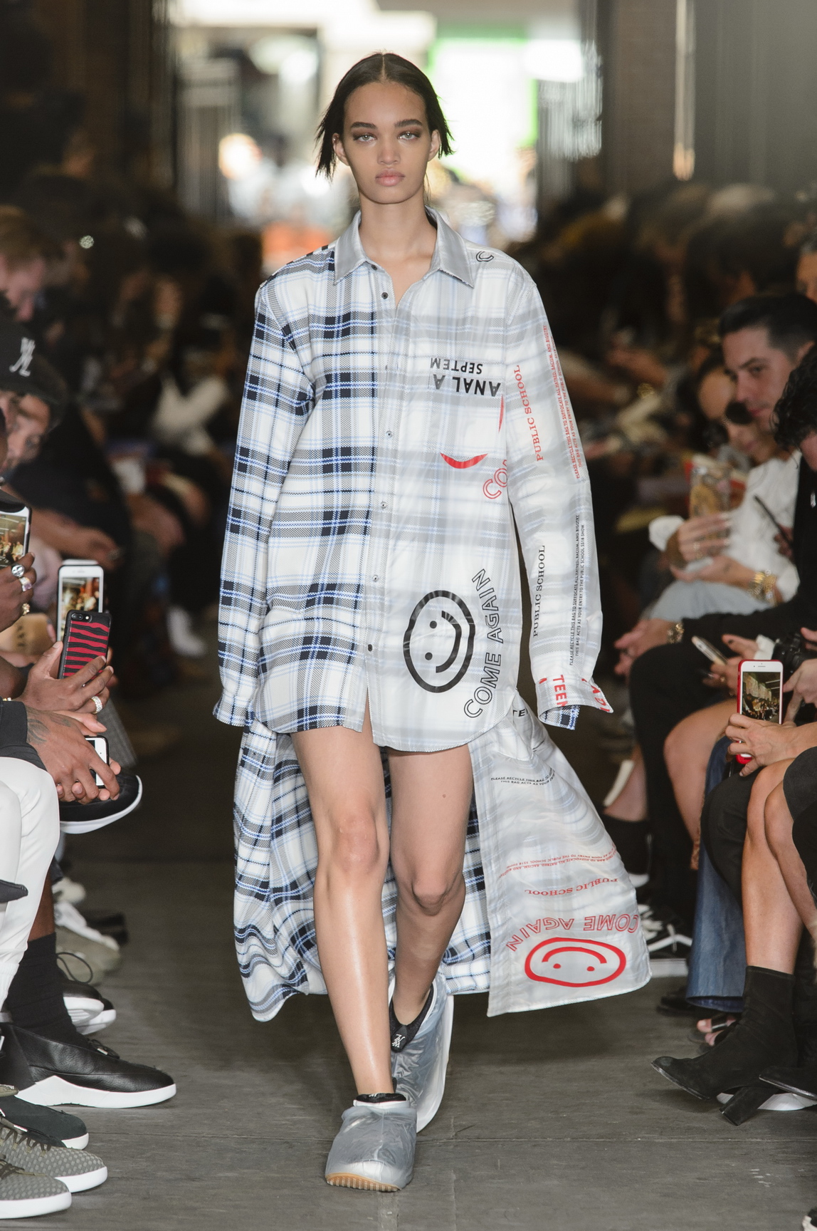 Fashion Week hasn’t historically been a good time for opponents of packaging waste. Fancy cardboard invitations start flooding desks weeks in advance, despite the advent of Fashion GPS. When Public School’s invite arrived as a red plastic bag printed with the brand’s show info, at least one person called out the brand on Twitter for being a menace to the environment. Aren’t Maxwell Osborne and Dao-Yi Chow too smart to make waste for no reason? Yes, they are — the duo’s show was a clever take on consumerism and the lengths we go to preserve products. Jordan 15 sneakers came wrapped in plastic bags, and plastic-coated tailoring implored us to “Come Again.”