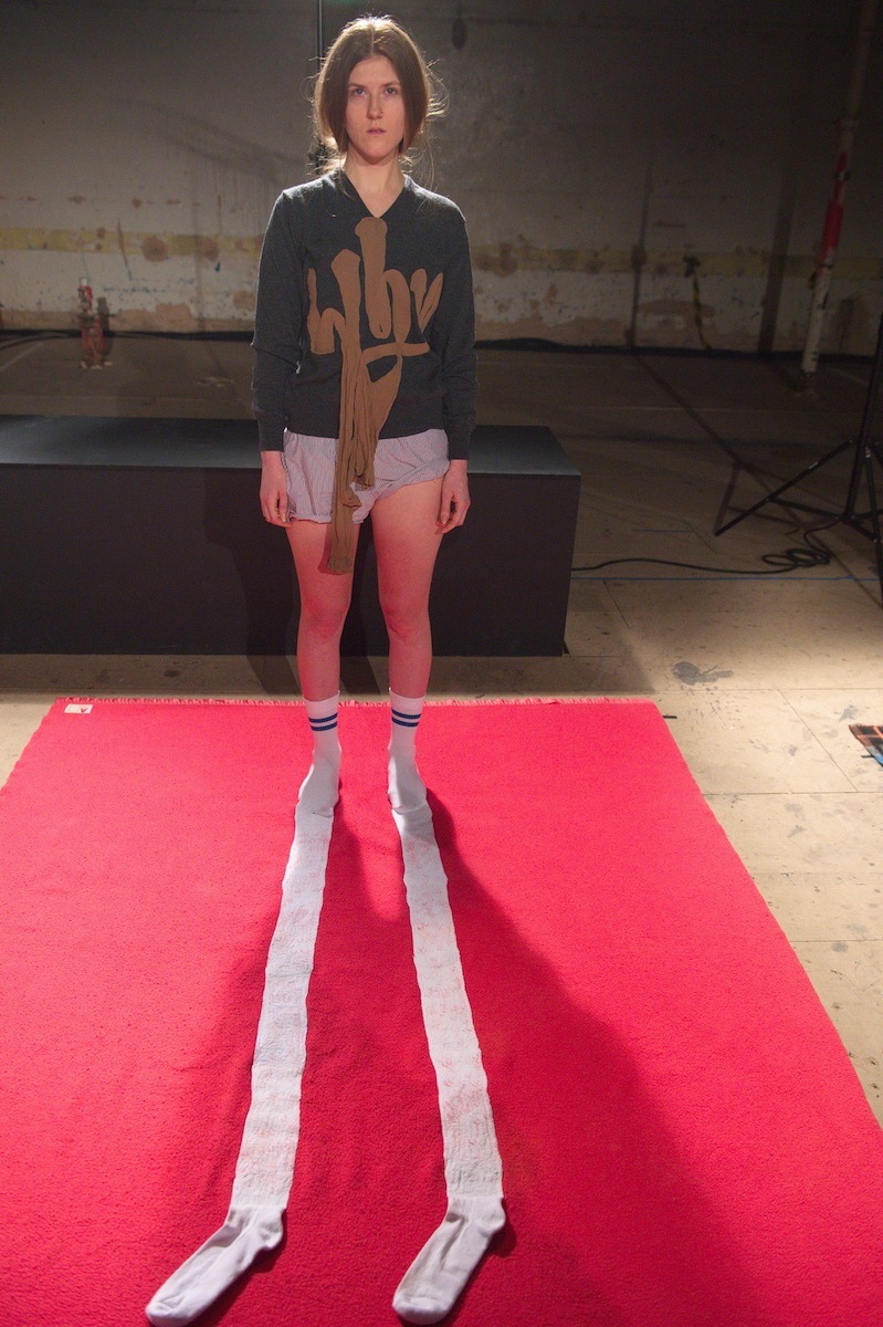First up: Rottingdean Bazaar, the project of James Buck and Luke Brook. Their project isn’t quite your boring old fashion brand (Rottingdean is a small suburb of Brighton). Instead, it’s focused on creative experimentation; clothes are merely the canvas for the pair’s wild ideas. At LFWM, they presented a rack of satiric care labels each individually boxed up, with usual instructions changed to read things like “fill in the stripes of a breton top with a permanent marker.” The duo also continued its love affair with socks, which were the centerpiece of last season’s shows. Buck and Brook presented some new t-shirts made out of fragments of ancient fabric the pair bought at auction.