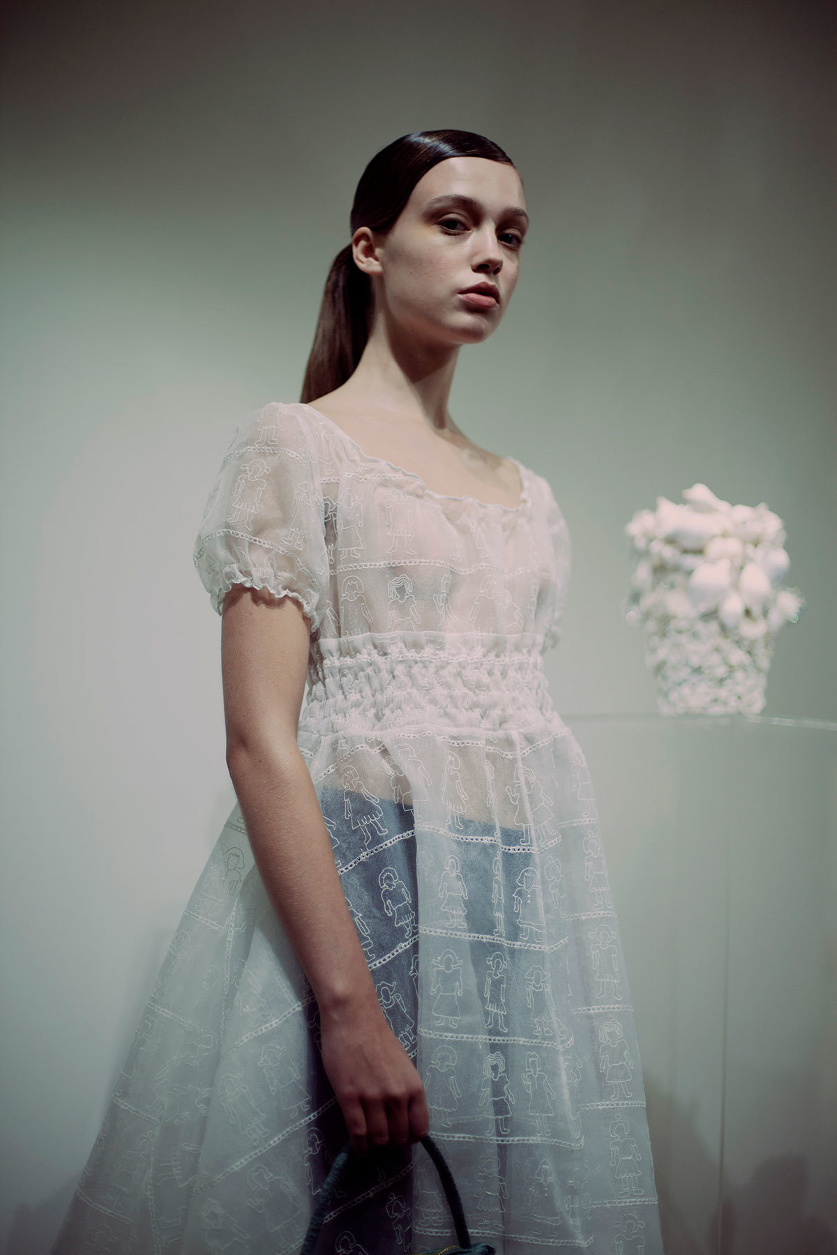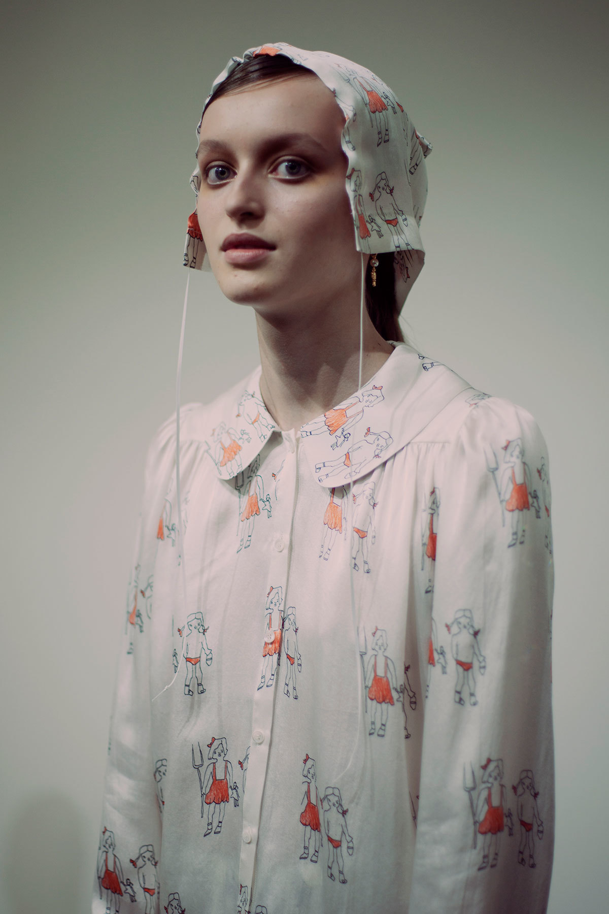 As her previous Shrimps collections have, Hannah Weiland’s latest offering takes its cue from art — the early Breton work of Paul Gauguin and Edward Wadsworth to be precise. The DNA is still the same but Shrimps is evolving before our eyes. Hannah’s charming doodles are sprawled across silk shirts and matching trousers, and there are touches of colorful faux fur everywhere: moss green stoles, black collars, and a particularly striking pink coat. Beyond these signatures, there is a confidence and maturity. Keeping to a tonal palette of soft creams and frog greens, with hints of yellow and salmon pink, the fabrics used are much more varied than we’re used to seeing. This season’s offering includes gingham, ruffles, and Breton stripes. Particularly notable are the white organza tea dresses, rendered with a delicate broderie anglaise, which were teamed with silk bonnets and Converse — a special collaboration with the iconic shoe brand — at her London Fashion Week presentation. As we navigated Suzanne Beirne’s sparkling shell set, Hannah talked us through the collection.