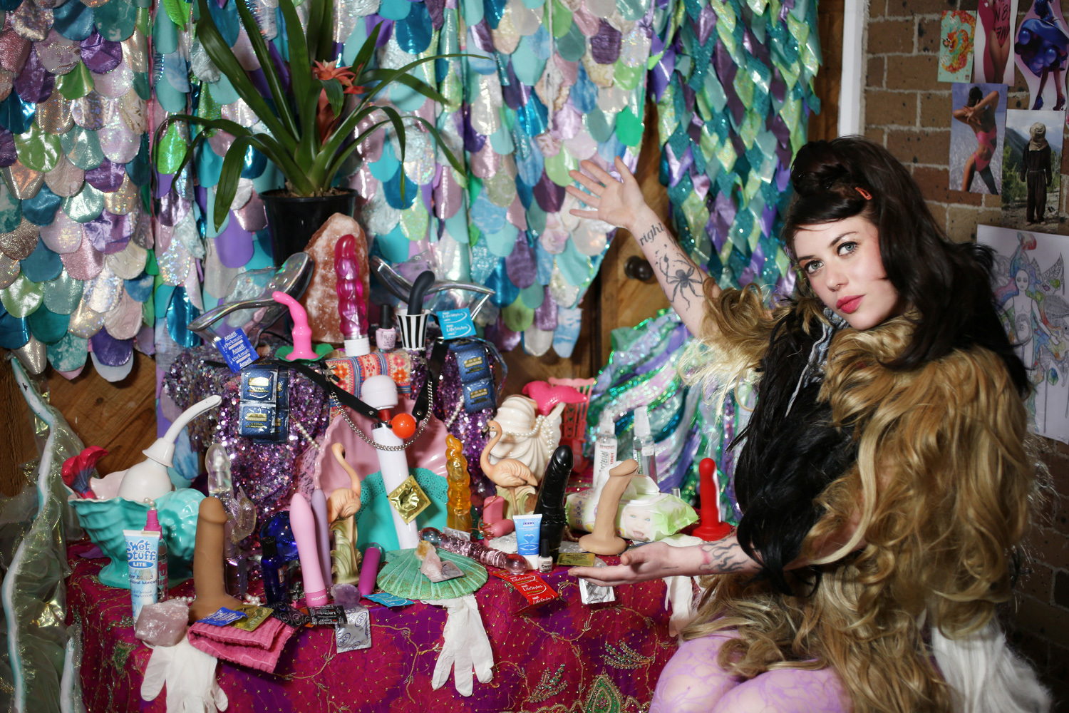 The set was actually made by a co-ho (a sex work colleague), and I didn’t see it until the night before the show. She made it after being on a three day bender. The brief was “make something that looks kind of fucked but also like it comes from a community theatre props cupboard, make me feel like a princess, and put some dicks in there.” I think people feel like the brothel is such a mysterious place, and having a set that had a magical mystery vibe was keeping with that idea.