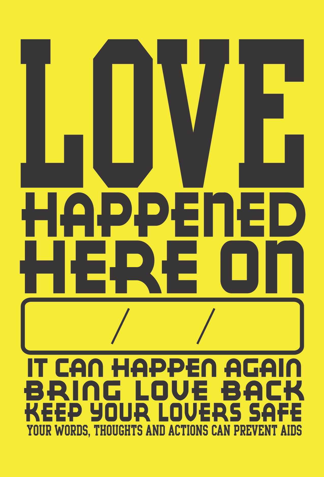 a bright yellow poster with black writing that reads love happened here on – with a space for a date