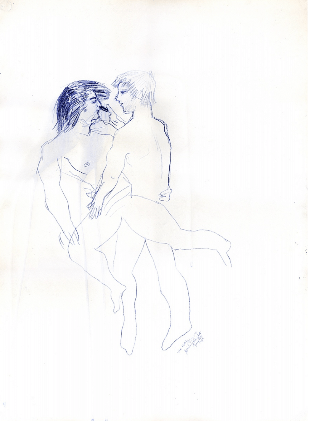 a pencil sketch of two naked men embracing, while one holds poppers up to the other's nose