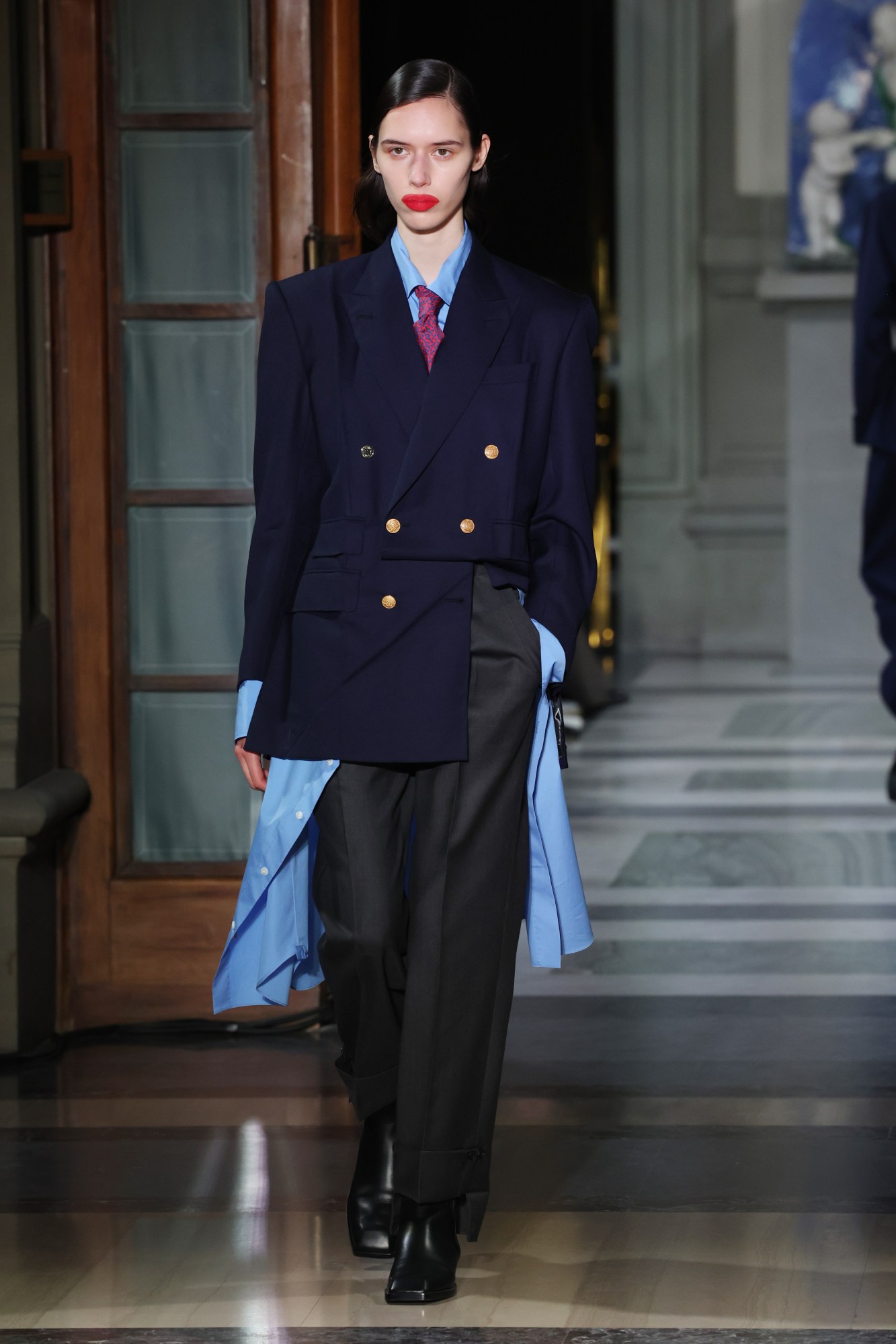 At MM6, Maison Margiela’s historically wearable diffusion line, leather, and western wear were on full display. Star-printed suits and shirts were a nod to Miles Davis with a jazzy blue leather ensemble (sans undershirt) breaking up the flow of classic black overcoats. After the show, the models were instructed to mingle and grab drinks at the bar, having to shuffle their way between attendees for a complimentary Peroni—fuck it!