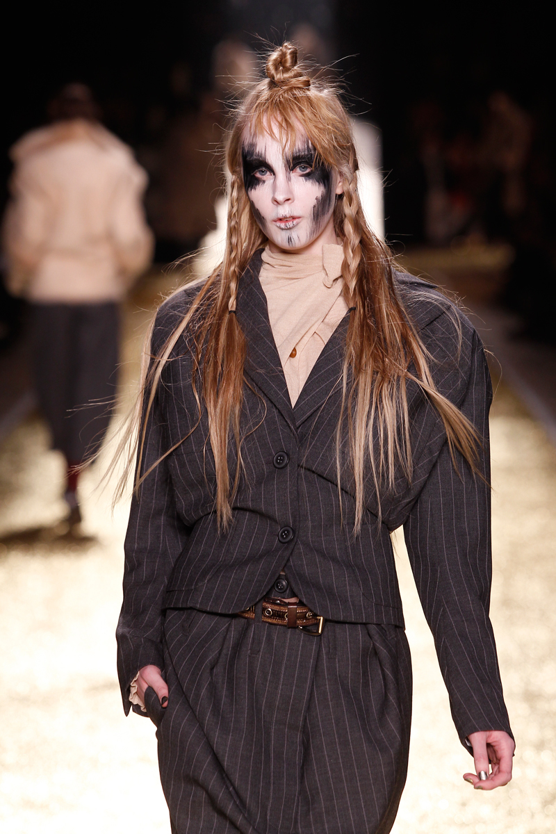 I love our toiles, our prototypes which we make in the natural calico before we decide the final fabric; it’s as if the garment epitomizes the first idea of itself. I took a very conservative man’s tailoring fabric (I love conservative fabrics — they have so many ideas to play with), a fresco in grey chalk stripe, and made a suit comprising a jacket from two years back and a favorite skirt — the ‘alien’ skirt — World’s End customers will know this skirt. We didn’t sell the jacket at the time because it has a lot of volume around the shoulder (masculine? But cross-dressing is as old as the hills) and over the breast — but I adore it because it makes a woman look important and there is nothing more sexy than that. I shall wear this suit. Next fall it should go into our archive but it will come home with me instead. One thing I knew about the collection — I wanted the woman to look important.