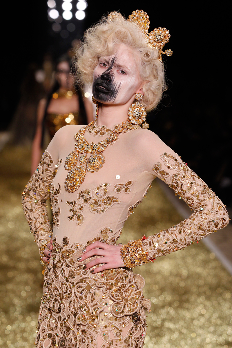 Andreas had also designed gloves and jewelry, but when the sample shows arrived they were not nicely made. Therefore, he got them done in the gold sequin fabric and asked for a gold catwalk. Nobody will see them because of the reflection. When they arrived they were were nicely made anyway and coincidently Andreas’s friend Tony, who does the look and lighting of the show, had prepared ideas for a gold catwalk.