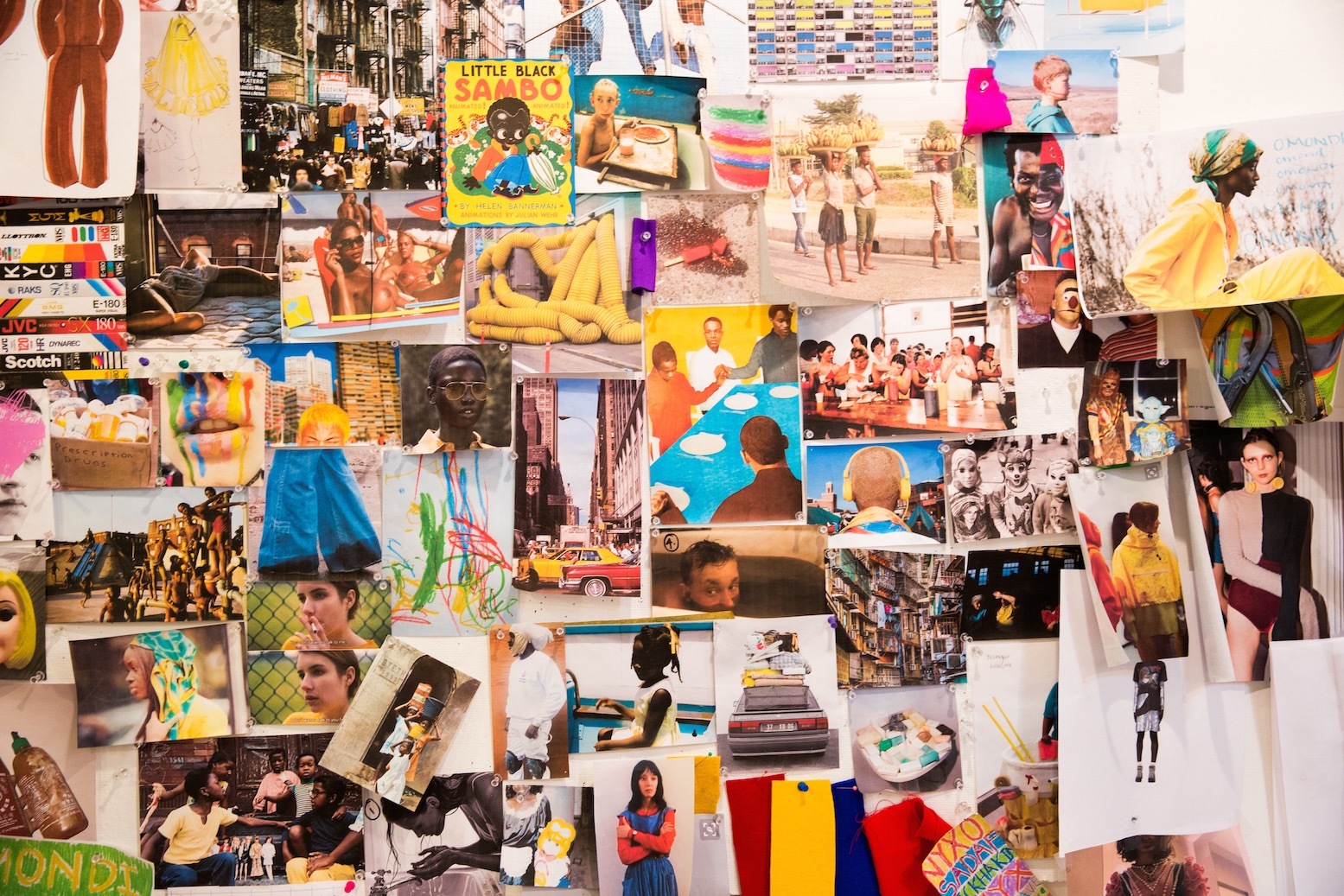 On a recent morning deep in Bed-Stuy, Recho Omondi stands near a stove pouring tea in her apartment-cum-design studio. On one side of the would-be living room are long wooden work tables, a sewing station, and a wall of pictures that inspired current and past collections: a scene from Harmony Korine’s 1997 Midwestern dystopian art film Gummo, a Martin Parr shot, a still of Penelope Cruz in Woody Allen’s Vicky Cristina Barcelona, a series of gritty stylized scenes of black folks engaged in everyday life, and handmade patterns. Dressed in her label’s latest Omondi custom sweater along with graphic Jacquemus shoes and her hair braided back into blonde cornrows, Recho is the perfect incarnation of her brand.