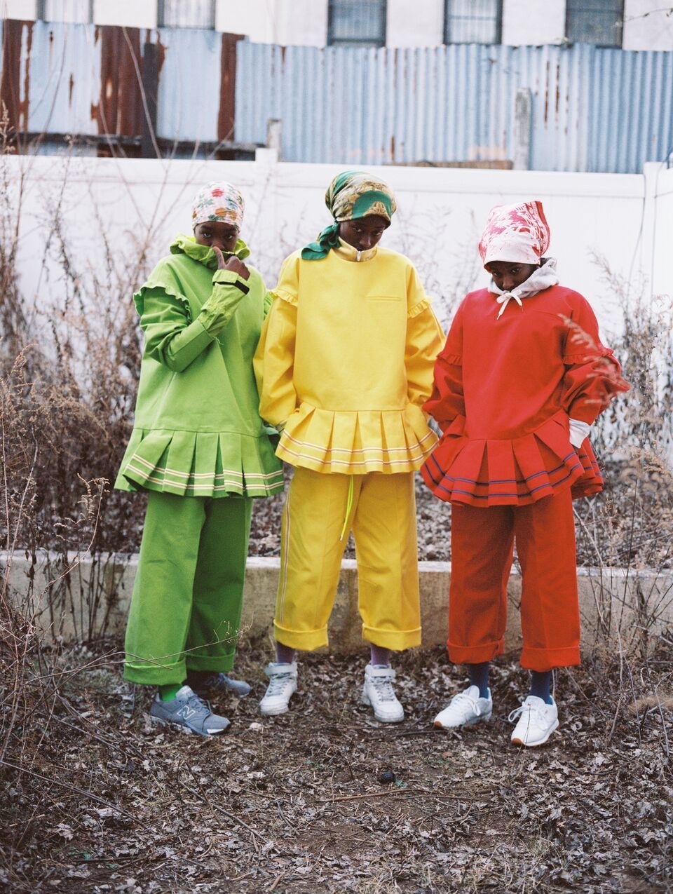 “Color is always the first thing I start with,” says Omondi of the way she has begun each of her label’s three collections. For her first outing, she says, “I was gravitating toward pink, and pale, muted colors, and my eyeballs would just vibrate towards those colors everywhere I’d go.” She adds, “Before you know it, everything around you, your whole world is this thing that you’re feeling all the time.” For the current collection (“003″) she drew inspiration from the warmth of the color yellow, prompting the bright, primary colors like the fire extinguisher red and Sesame Street green.” She was also binge watching the Netflix shows Stranger Things and Narcos.