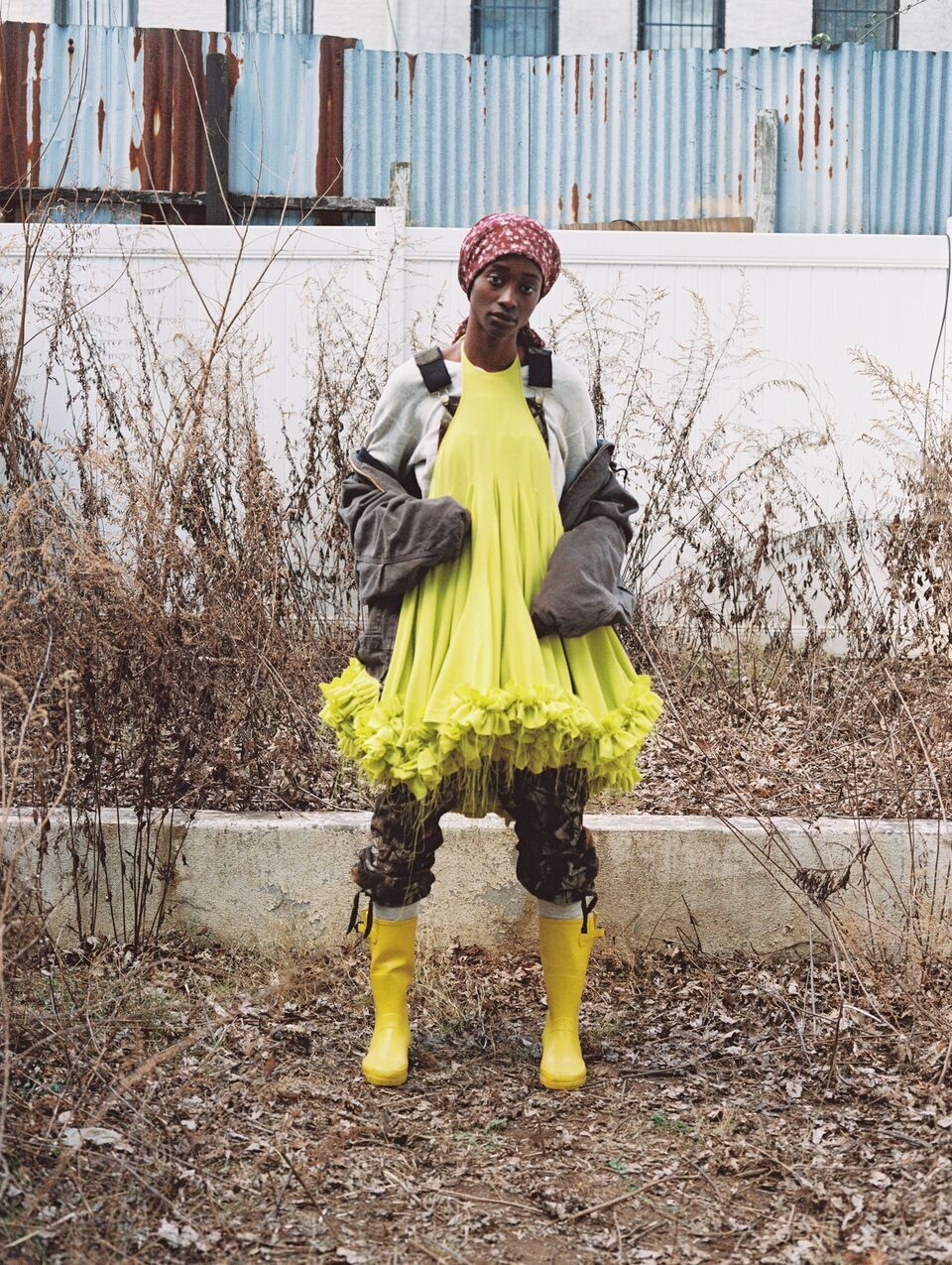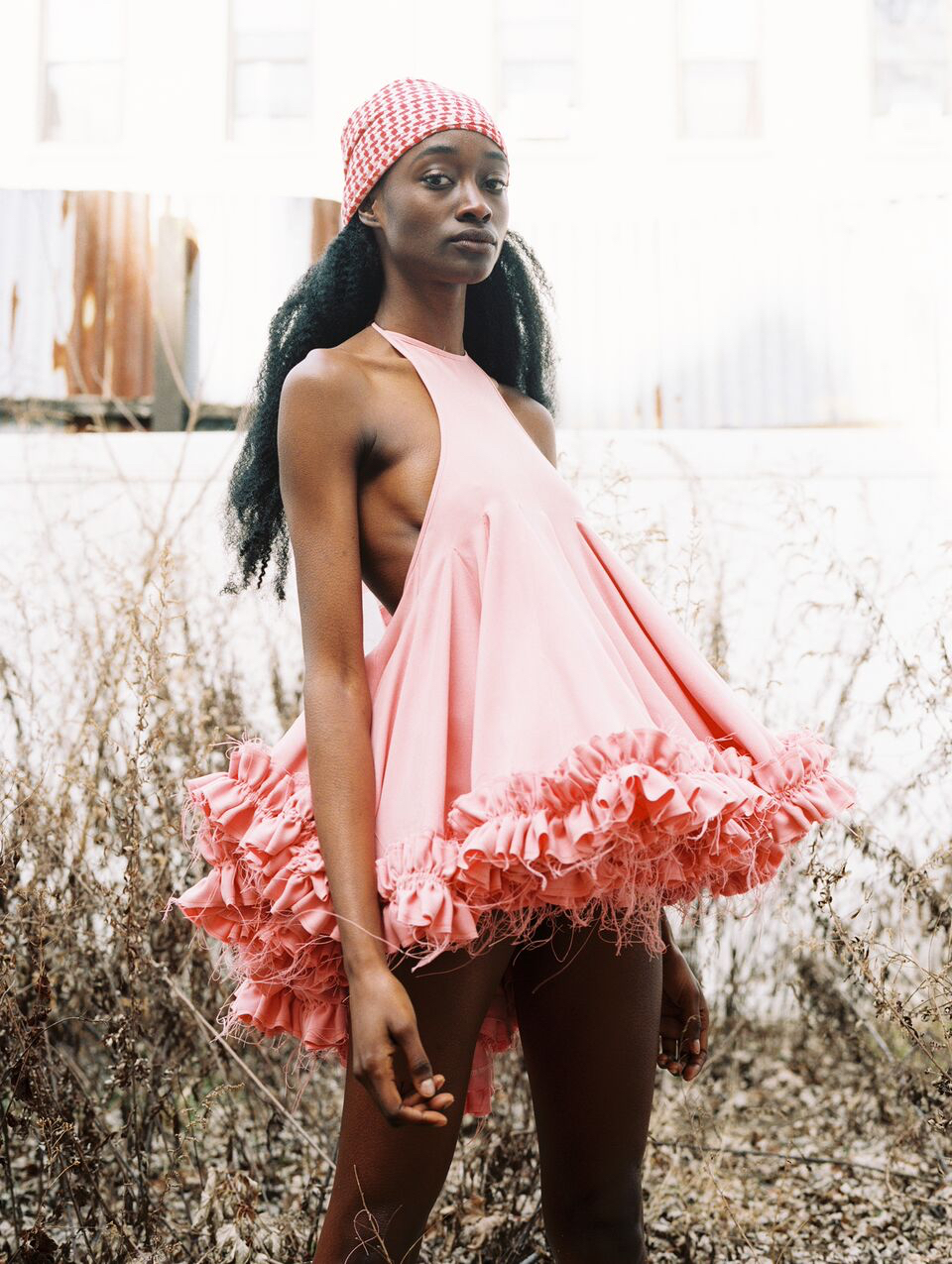 “I don’t believe in collections any more,” says Omondi. She thinks the fashion industry’s current structure of showing new clothes six times a year produces too much waste. For 003 she says, “I’m focusing on one style, which we’ve called the Carmichael,” a flat, shapeless halter dress named after Troy Carmichael, a precocious young black girl who is seen coming of age in Bed-Stuy during the summer of 1973 in Spike Lee’s 1994 film Crooklyn. “It doesn’t really look like something she would wear, per se,” admits Omondi of the more tomboyish Carmichael, who lived in a brownstone full of brothers. “I just think she was so cool, and she reminded me so much of me.” In naming the dress after Lee’s character, she seems to be inserting real representations of black girls like Carmichael, who remained graceful and grew independent because of her block’s challenges, into fashion’s narrative.