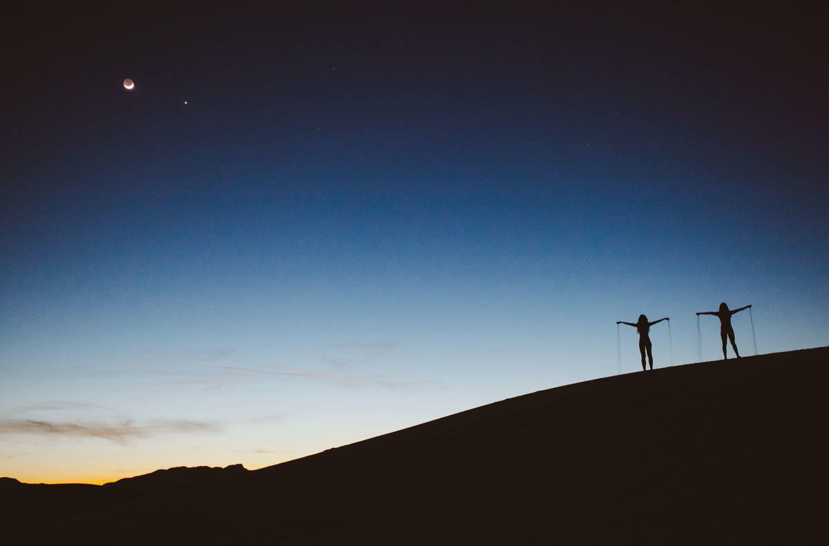 Chrissie: Waking up at sunrise in White Sands, New Mexico. Elle, Rachel, and I climbed up on a sand dune to see the sky light up. We were wrapped in blankets and had a little Tibetan bowl with us. It was just one of those tender moments where I felt happy to be alive, with my friends, surrounded by nature.
