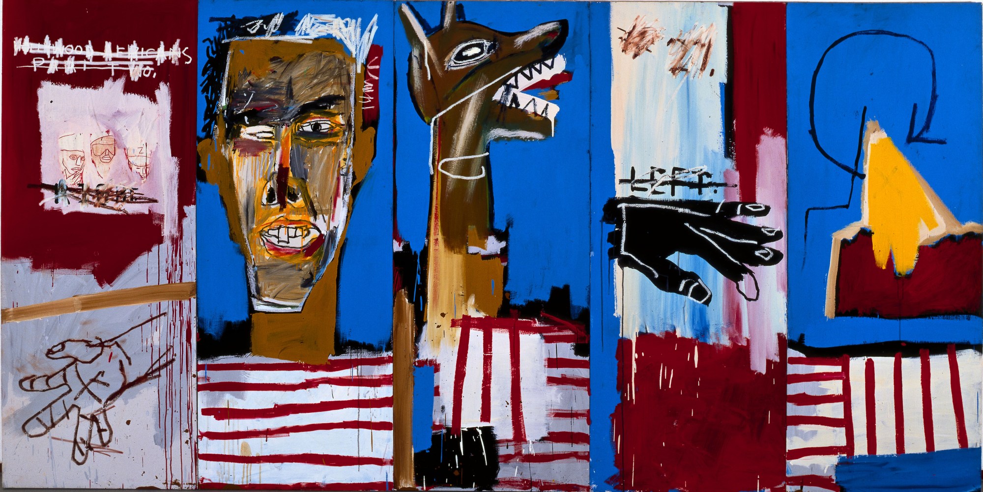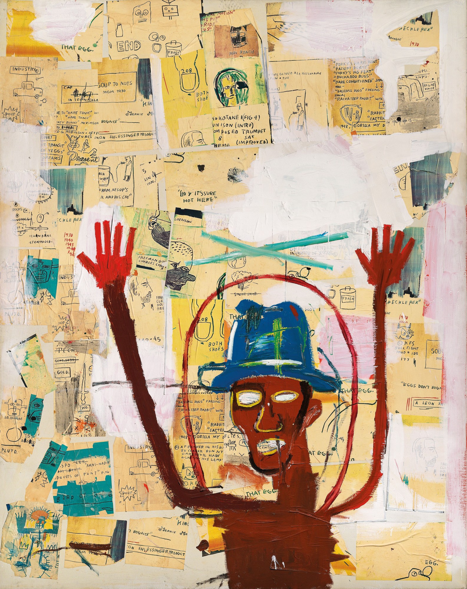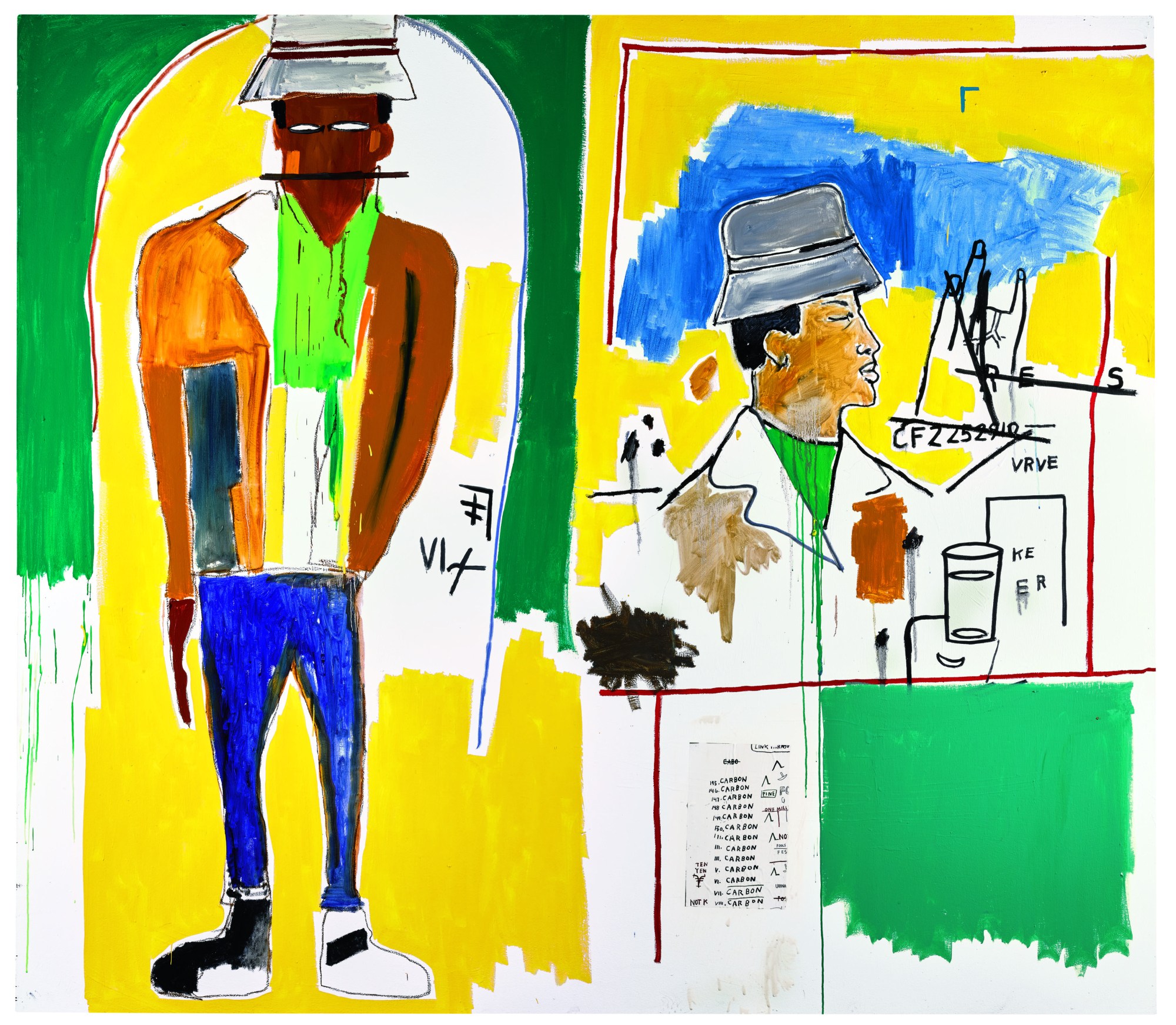 From 1982, Basquiat started using Xerox to replicate his own drawings and collages, sprinkling them in his larger works. “It’s kind of like he’s sampling himself, like a hip hop producer would,” Vincent notes. The print of a men’s shoe (worn by Erica Bell, an African-American dancer who collaborated with Madonna at the early stage of her career) is used in one work, while a dozen Xeroxes are glued to look like toe-tapping or dancing in another. “You can think about it as someone who has a melody in mind,” Vincent points out. “Like: How do I use that melody and what can I do with the same series of chords?”